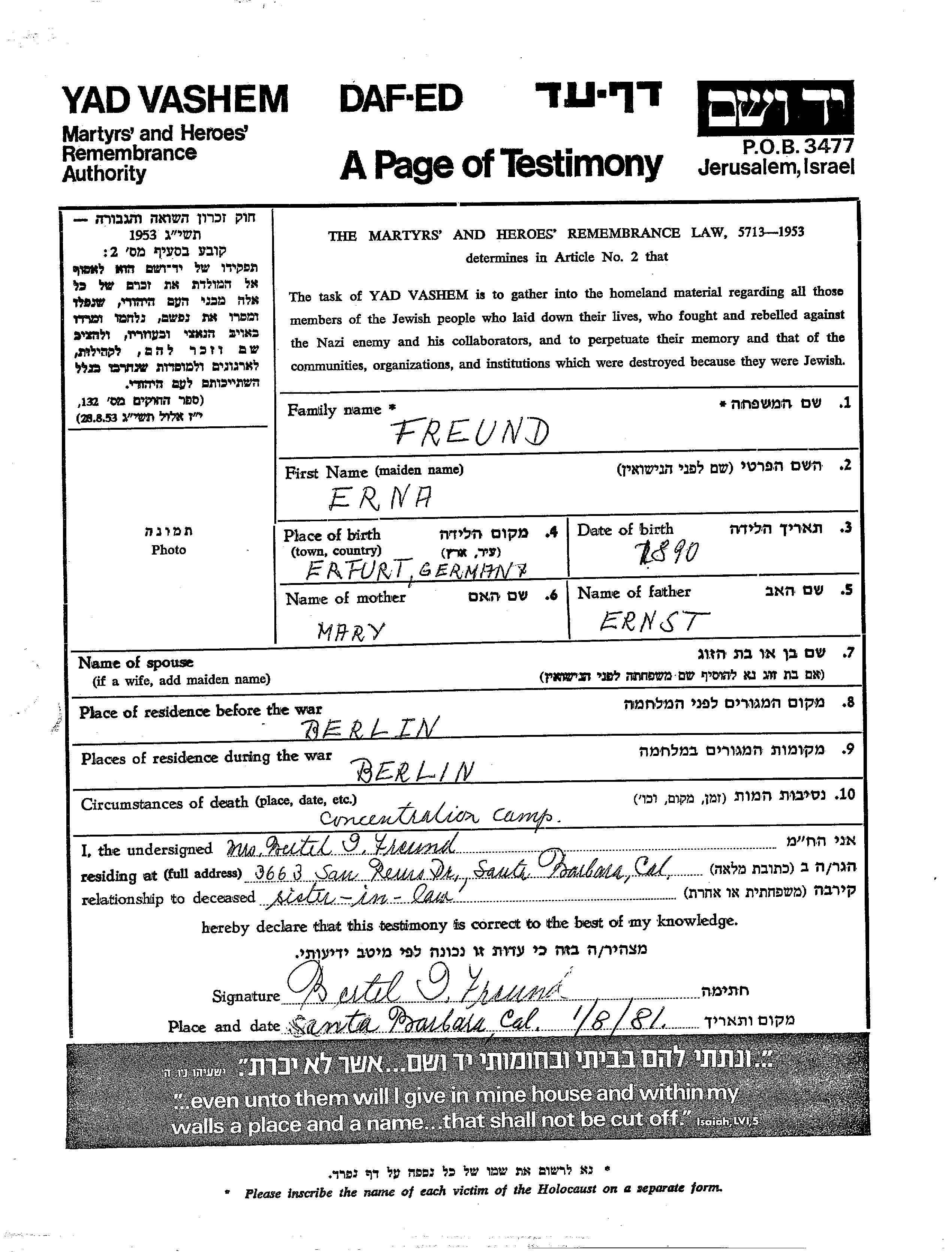 Erna Freund wurde im Jahr 1890 in Erfurt, Deutsches Reich geboren. Sie war die Tochter von Ernst und Mary. Vor dem Zweiten Weltkrieg lebte sie in Berlin, Deutsches Reich. Während des Krieges war sie in Berlin, Deutsches Reich.