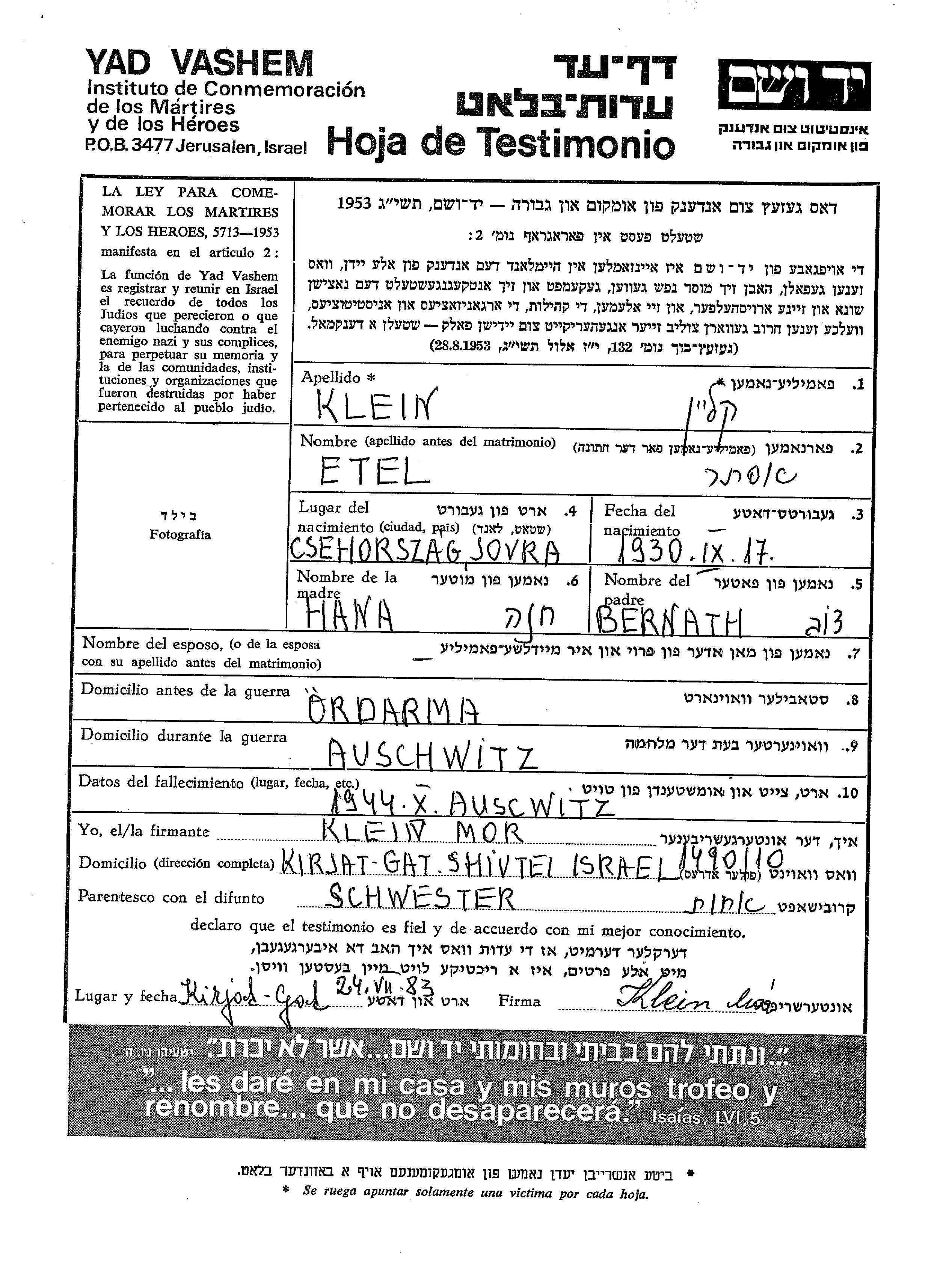 Etel Klein wurde im Jahr 1930 in Sovar, Tschechoslowakei geboren. Sie war die Tochter von Bernath Dov und Hana. Vor dem Zweiten Weltkrieg lebte sie in Ordarma, Tschechoslowakei. Während des Krieges war sie in Ordarma, Tschechoslowakei.