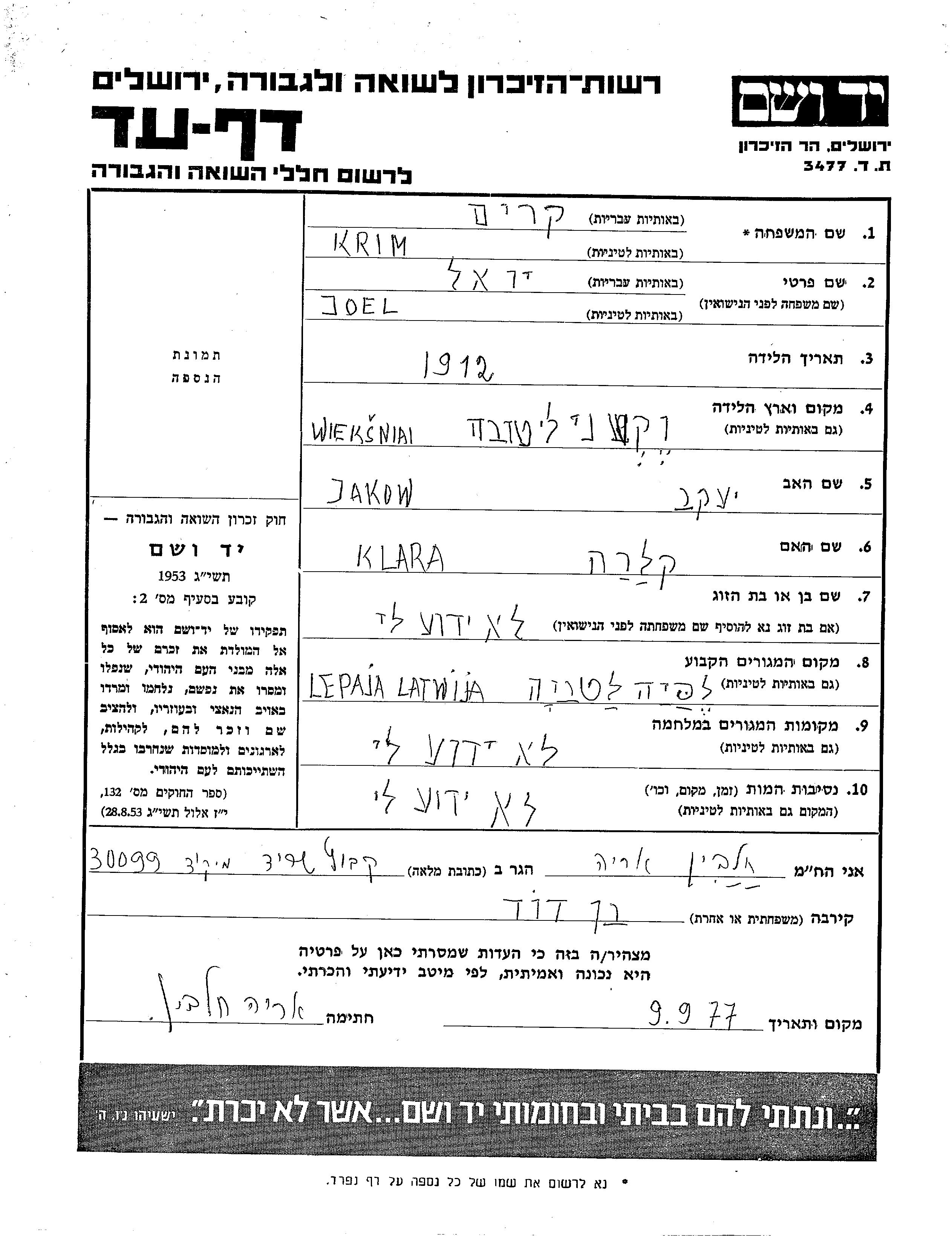 Joel Krim wurde im Jahr 1912 in Wekshniai, Litauen geboren. Er war der Sohn von Jakow und Klara.