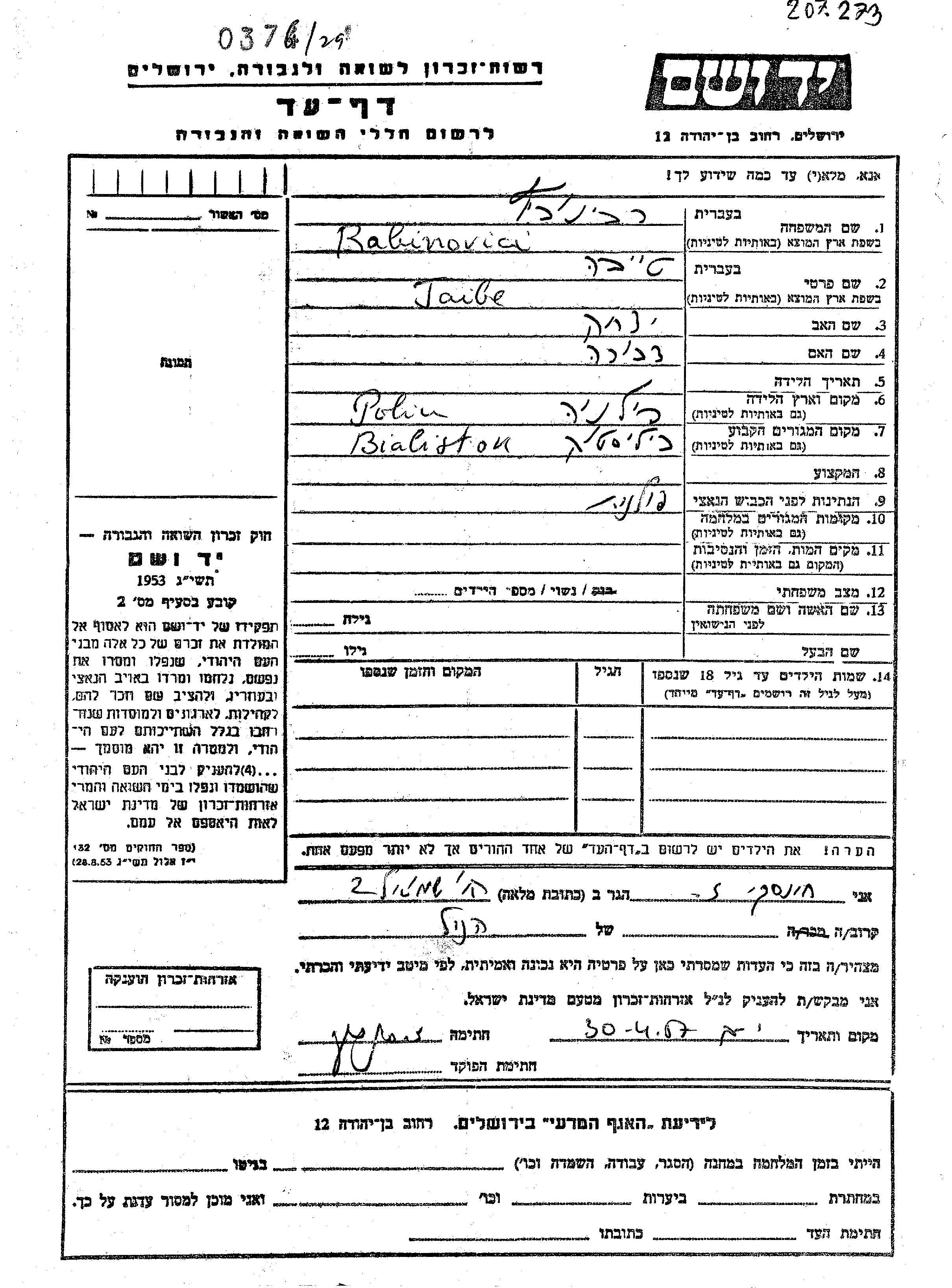 Rabinovici Taibe Bialistok, Polen Gedenkblatt