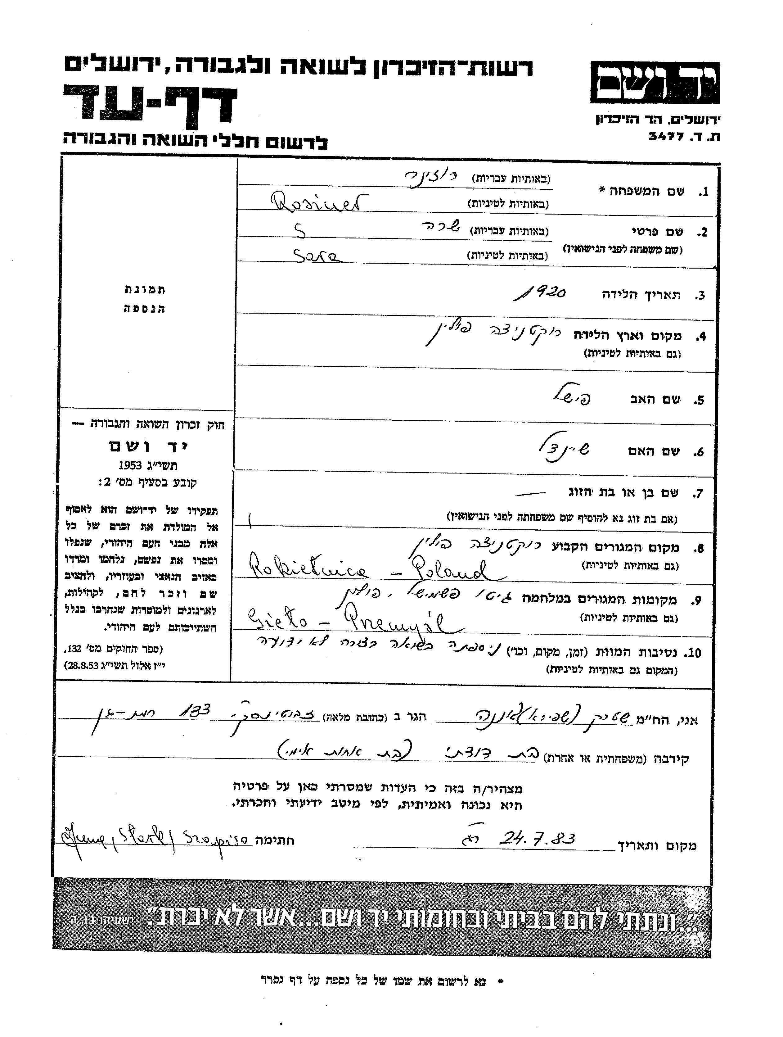 Sara Rosiner wurde im Jahr 1920 in Rokietnica, Polen geboren. Sie war die Tochter von Fishel und Sheindl. Vor dem Zweiten Weltkrieg lebte sie in Rokietnica, Polen. Während des Krieges war sie in Przemysl, Polen.