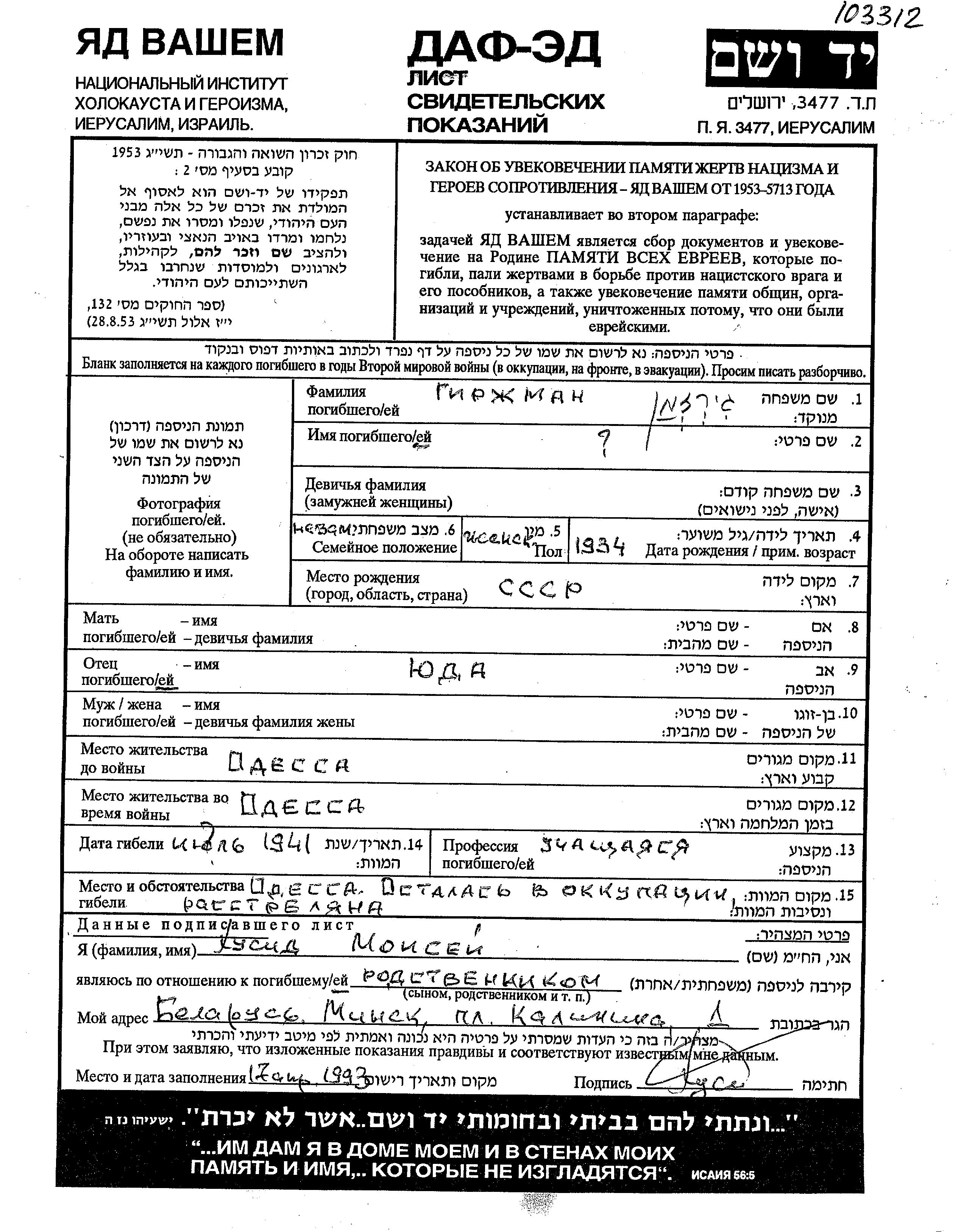 Vorname unbekannt Girzhman wurde im Jahr 1934 in Sowjetunion geboren. Er war der Sohn von Yuda. Er war Schüler/-in und Kind. Vor dem Zweiten Weltkrieg lebte er in Odessa, Ukraine (UdSSR). Während des Krieges war er in Odessa, Ukraine (UdSSR).