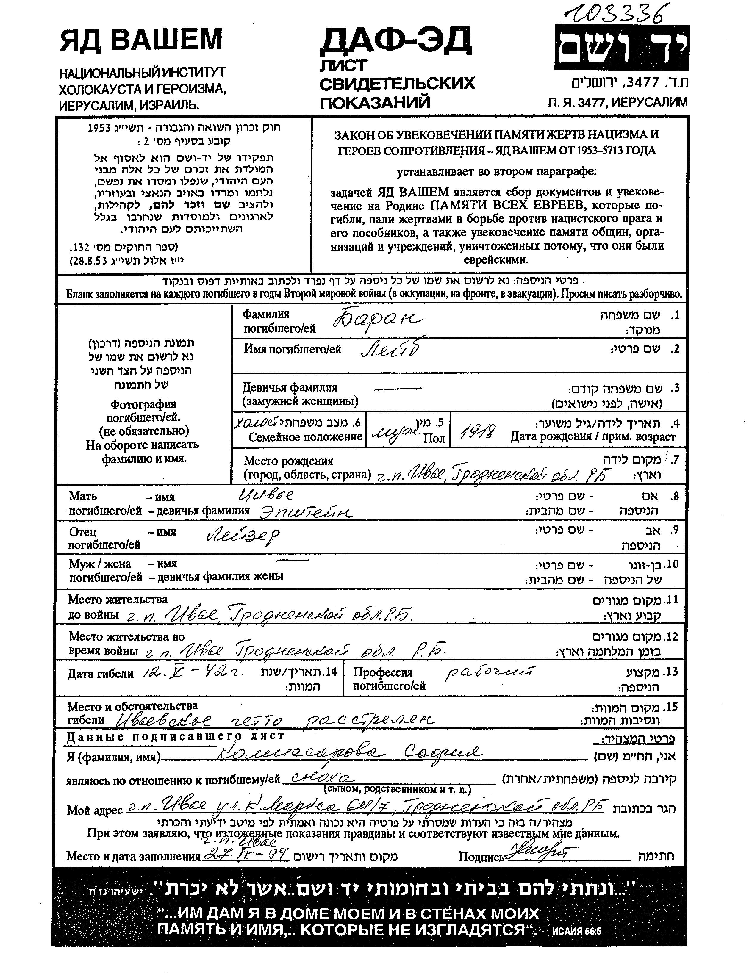 Leib Baran wurde im Jahr 1918 in Iwje, Polen geboren. Er war der Sohn von Leizer und Tzivie, geb. Epshtein. Er war Ledig. Vor dem Zweiten Weltkrieg lebte er in Iwje, Polen. Während des Krieges war er in Iwje, Polen.