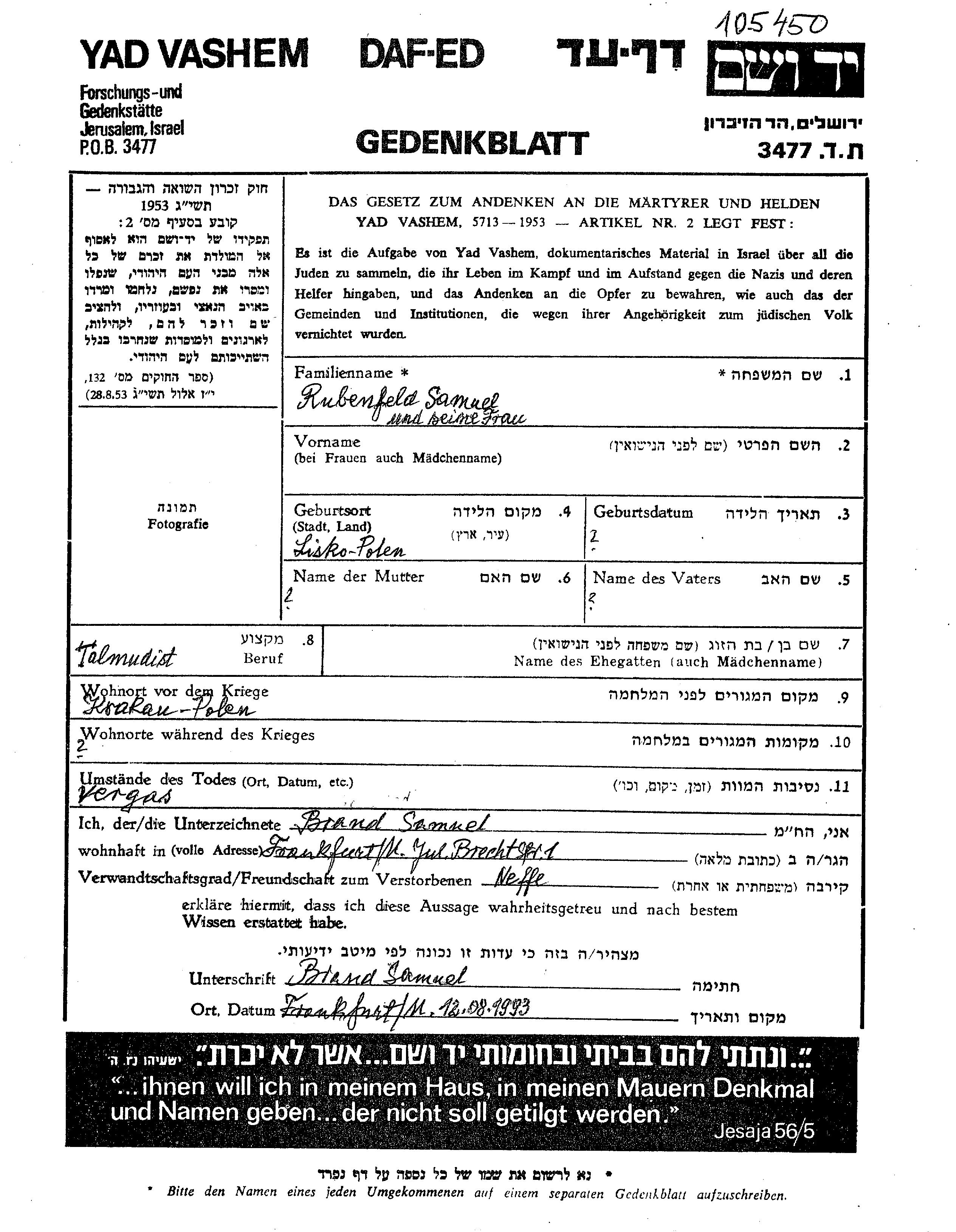 Samuel Rubenfeld wurde in Lisko, Polen geboren. Er war Talmudist und Verheiratet. Vor dem Zweiten Weltkrieg lebte er in Krakow, Polen.