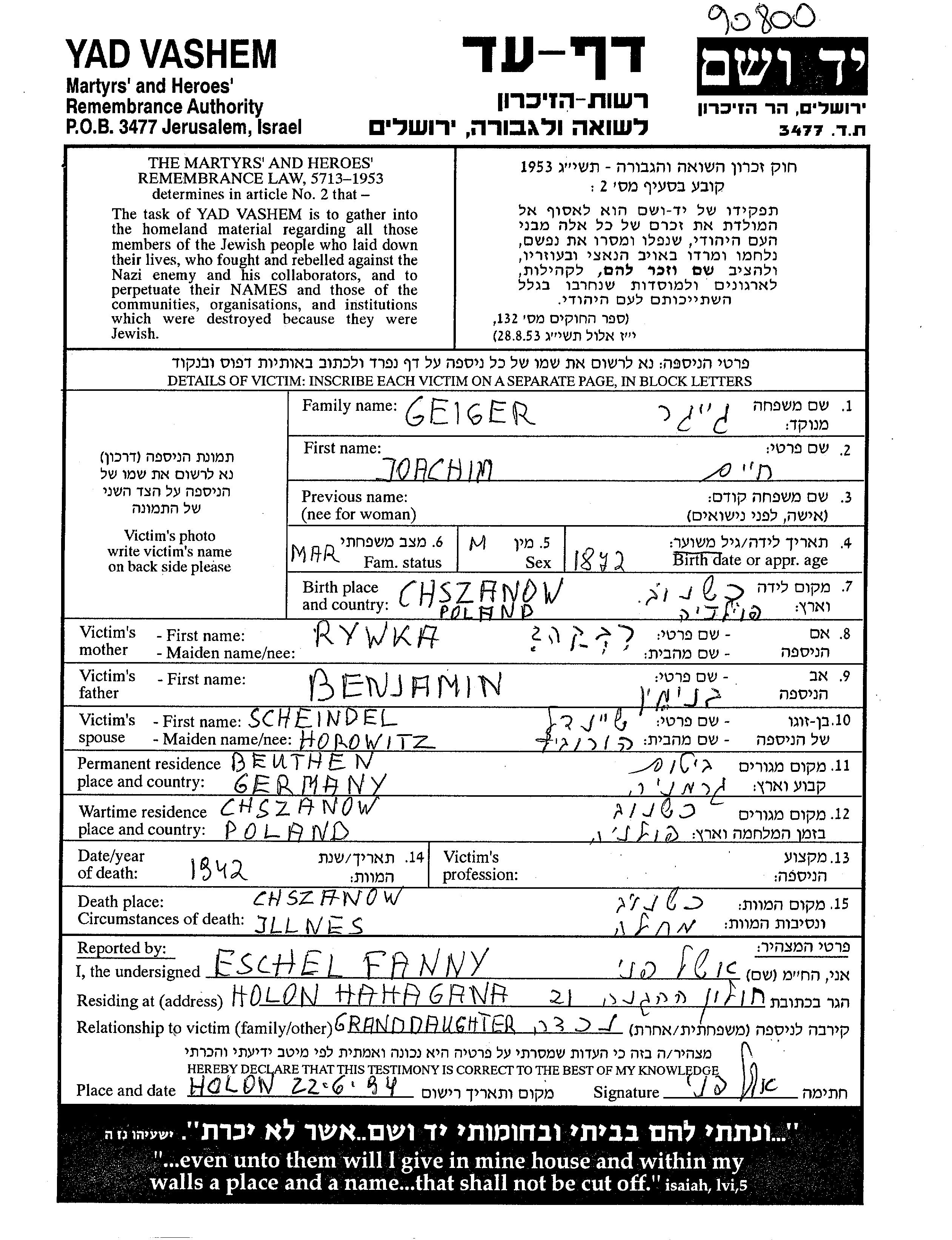 Joachim Khaim Geiger wurde im Jahr 1872 in Chrzanow, Polen geboren. Er war der Sohn von Benjamin und Rywka. Er war mit Scheindel, geb. Horowitz Verheiratet. Vor dem Zweiten Weltkrieg lebte er in Beuthen, Deutsches Reich. Während des Krieges war er in Chrzanow, Polen.