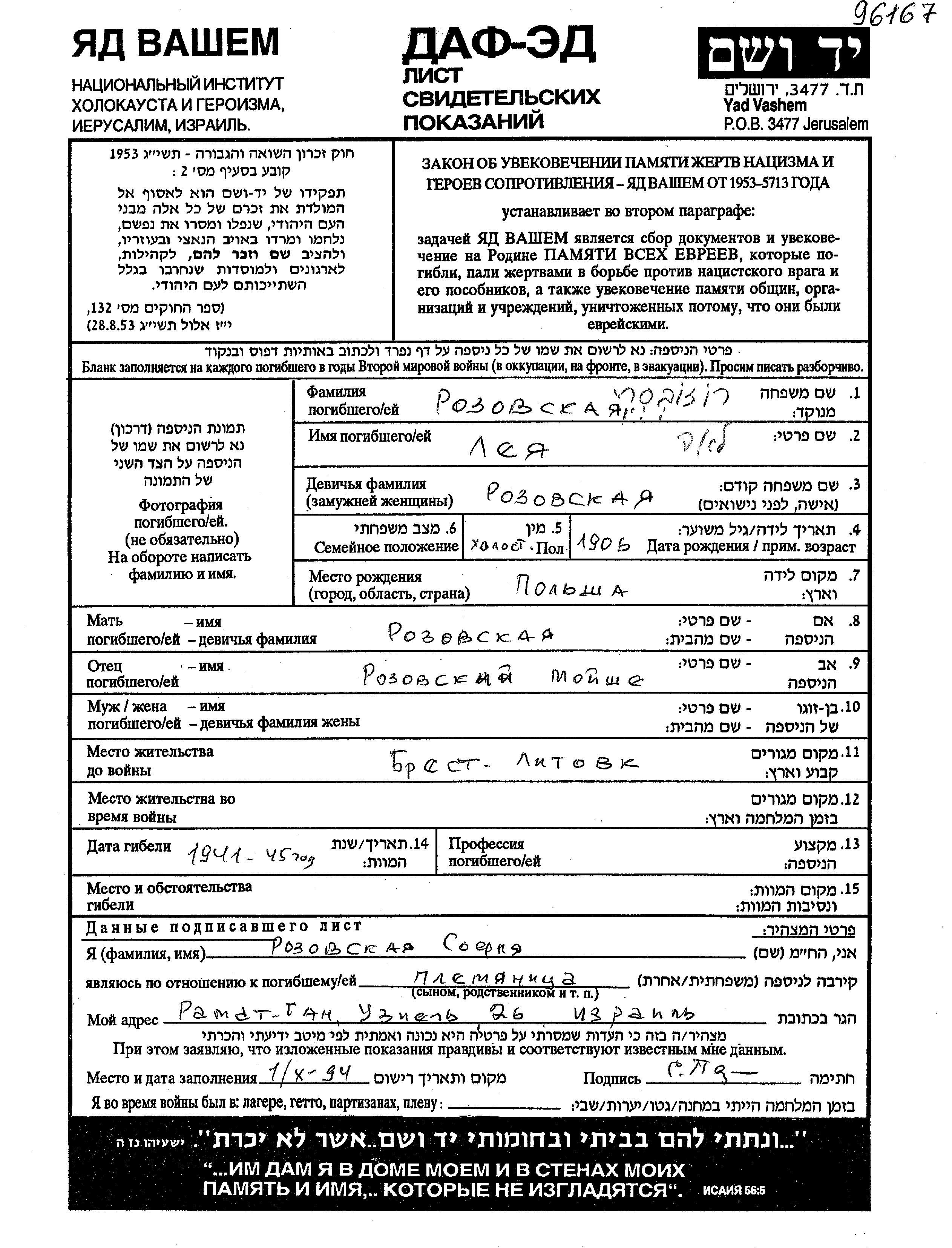 Rozovskiy Lea 1906 Brest Litowsk, Polen Gedenkblatt