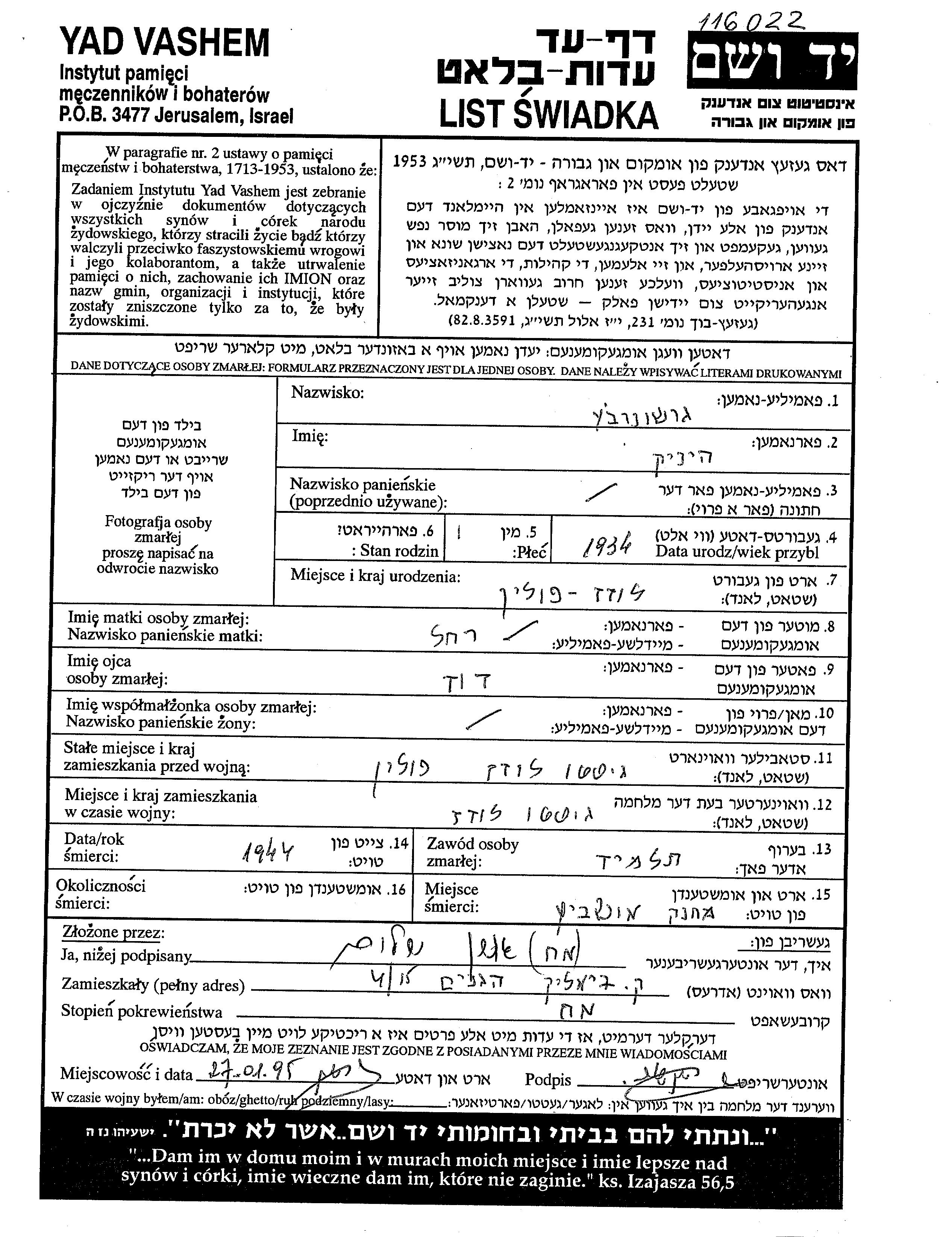 Gershonovich Henrik 1934 Lodz, Polen Gedenkblatt