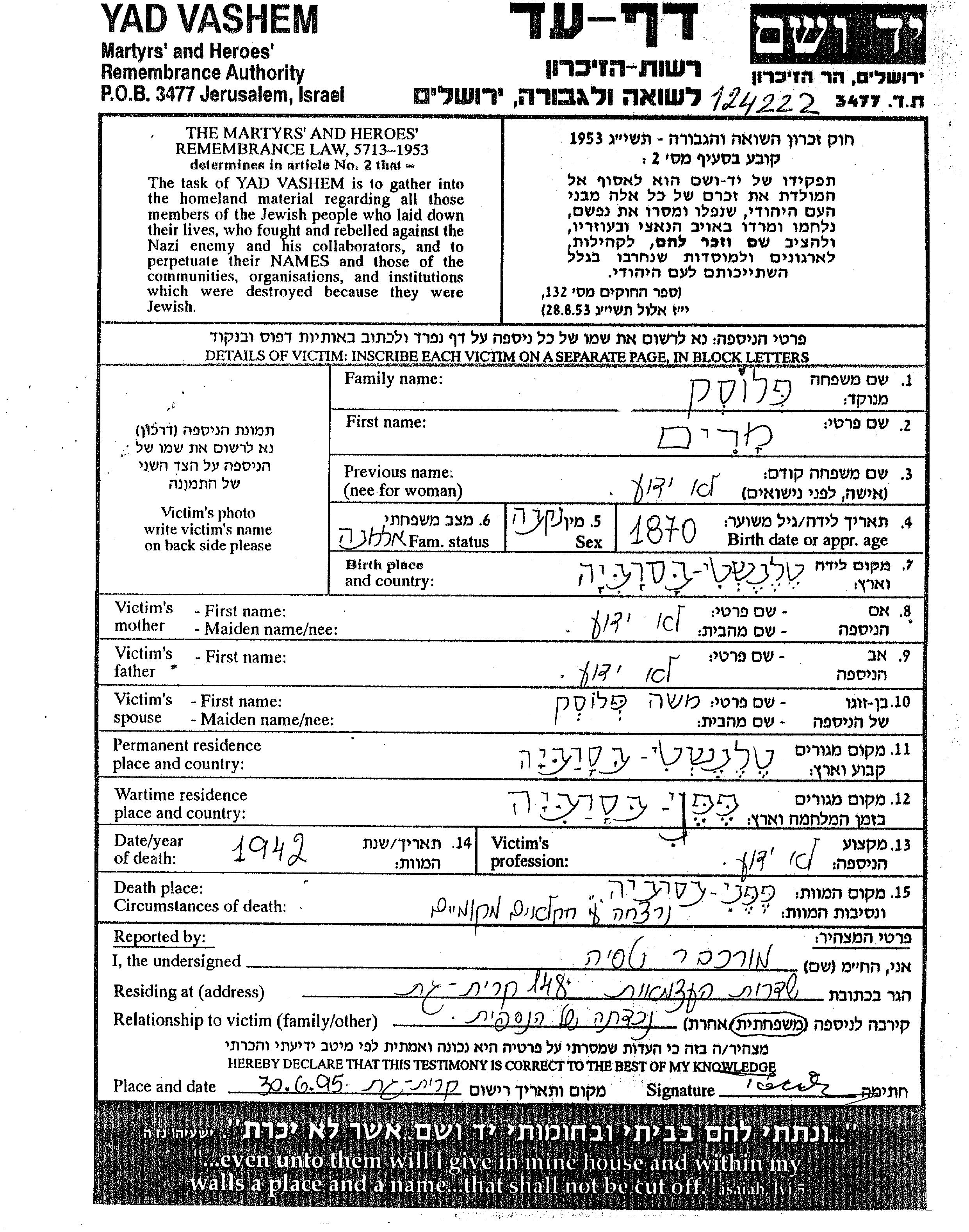 Miriam Plosk wurde im Jahr 1870 in Telenesti, Rumänien geboren. Sie war mit Moshe Verwitwet. Vor dem Zweiten Weltkrieg lebte sie in Telenesti, Rumänien. Während des Krieges war sie in Pepeni, Rumänien.