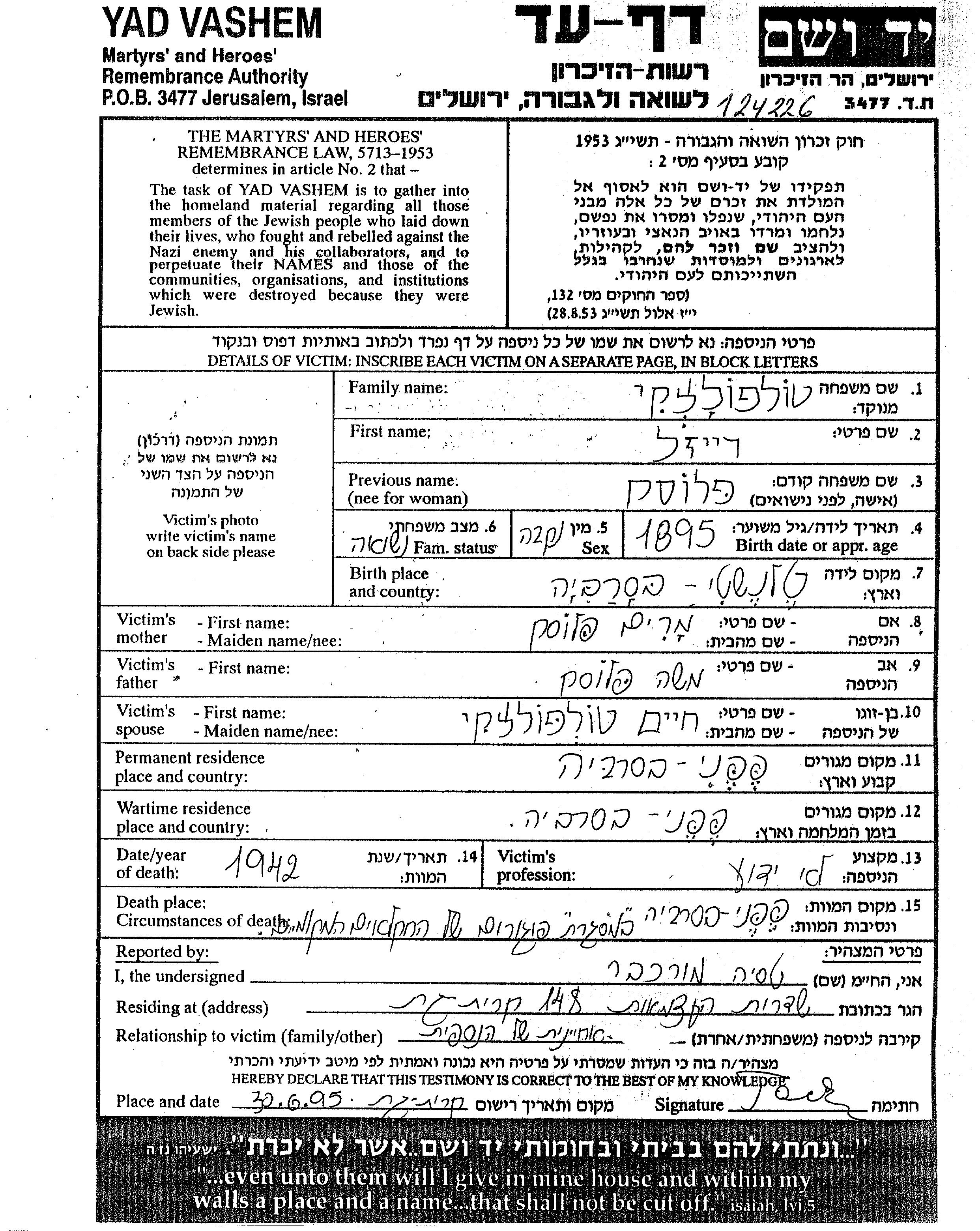 Reizl Tolpolatzki, geb. Plosk wurde im Jahr 1895 in Telenesti, Rumänien geboren. Sie war die Tochter von Moshe und Miriam. Sie war mit Khaim Verheiratet. Vor dem Zweiten Weltkrieg lebte sie in Pepeni, Rumänien. Während des Krieges war sie in Pepeni, Rumänien.