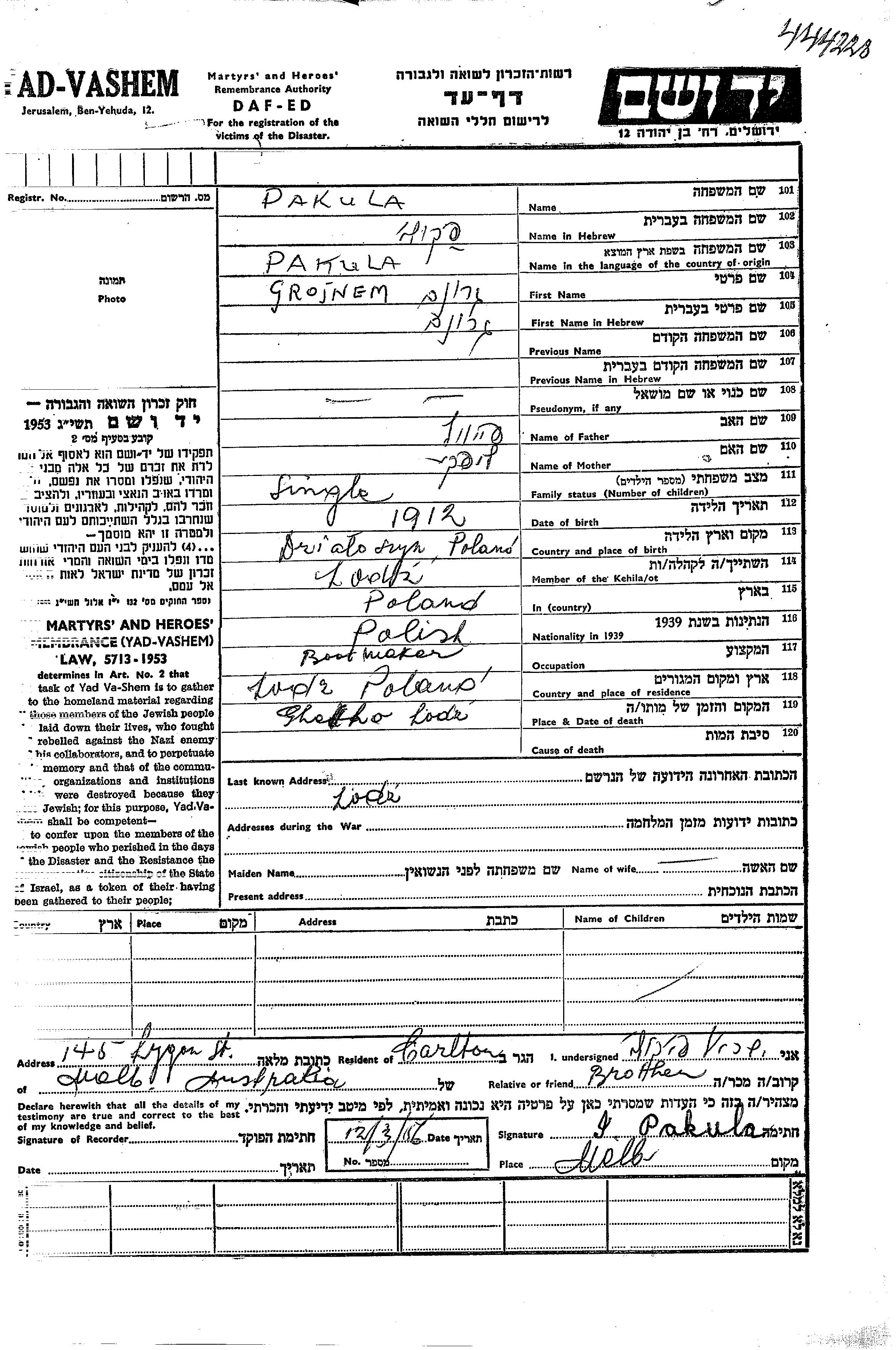 Groinem Pakula wurde im Jahr 1912 in Dzialoszyn, Polen geboren. Er war der Sohn von Faivel und Lipke. Er war Fabrikschuhmacher und Ledig. Vor dem Zweiten Weltkrieg lebte er in Lodz, Polen. Während des Krieges war er in Lodz, Polen.