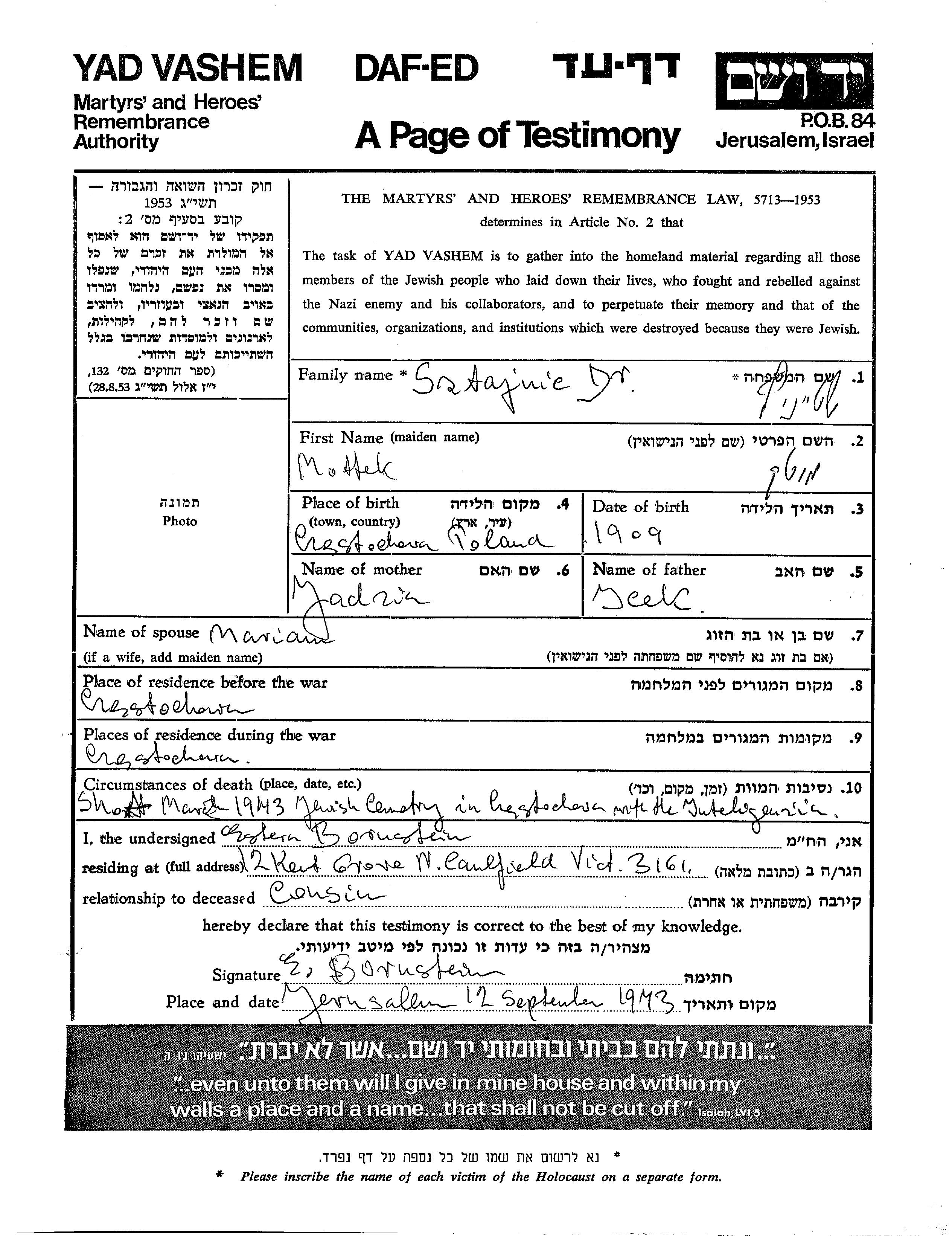 Dr. Sztajnic wurde in der Schoah ermordet. Todesort: Czestochowa, Polen im Jahr 1943.