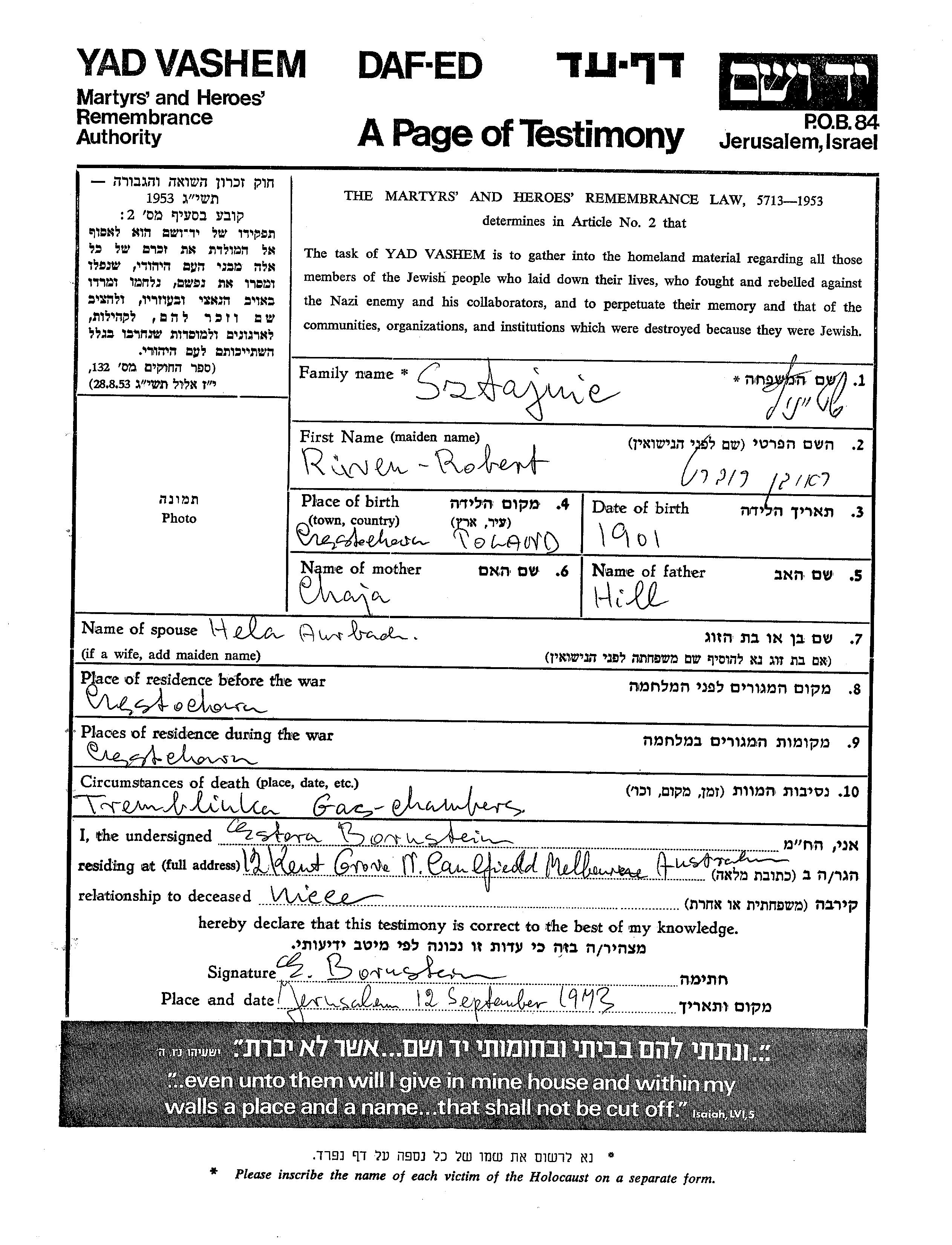 Sztajnic Ruven Robert 1901 unbekannter Ort, Gedenkblatt