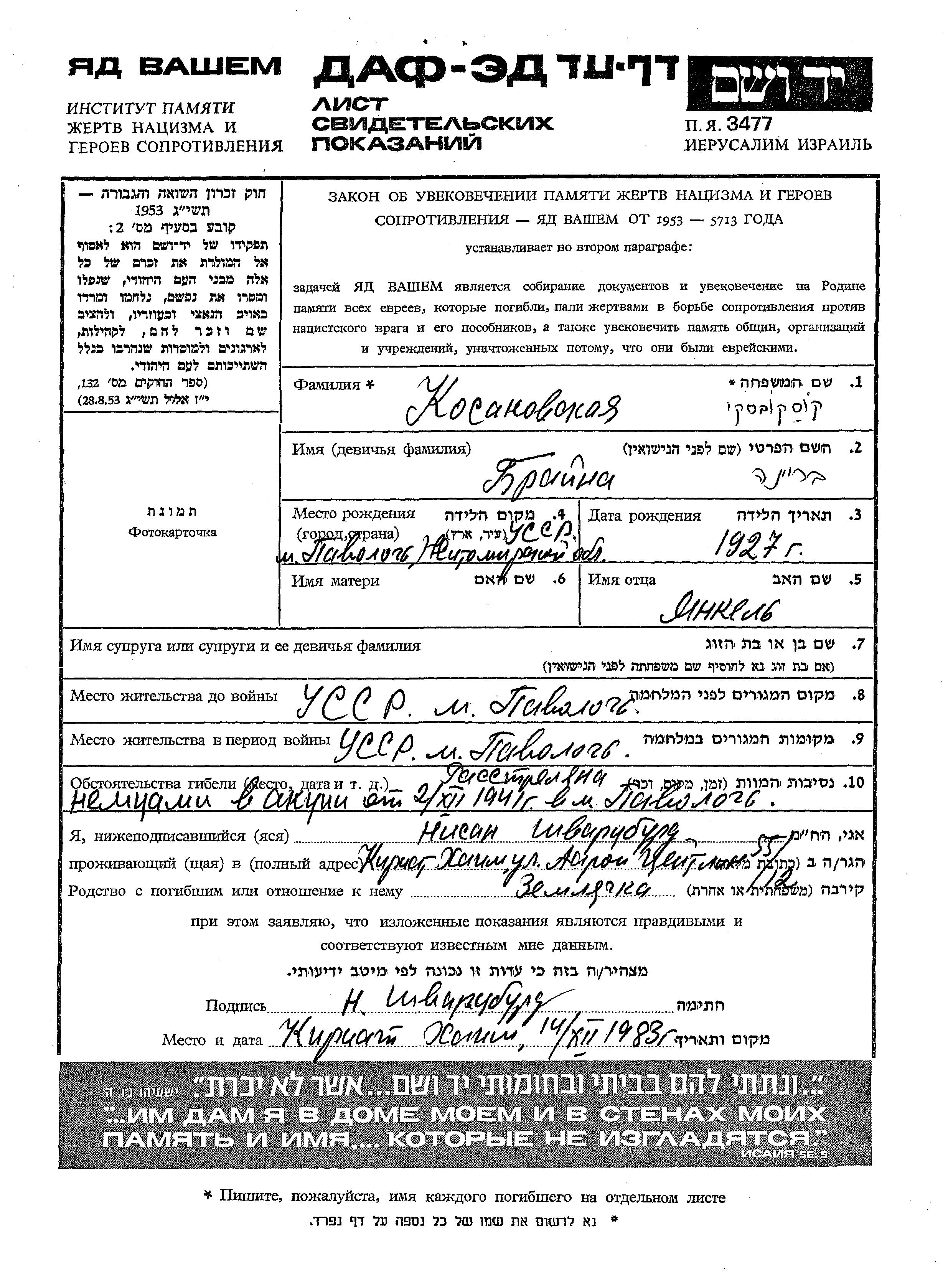 Braina Kosanovskaya wurde im Jahr 1927 in Pavoloch, Ukraine (UdSSR) geboren. Sie war die Tochter von Yankel. Sie war Ledig. Vor dem Zweiten Weltkrieg lebte sie in Pavoloch, Ukraine (UdSSR). Während des Krieges war sie in Pavoloch, Ukraine (UdSSR).