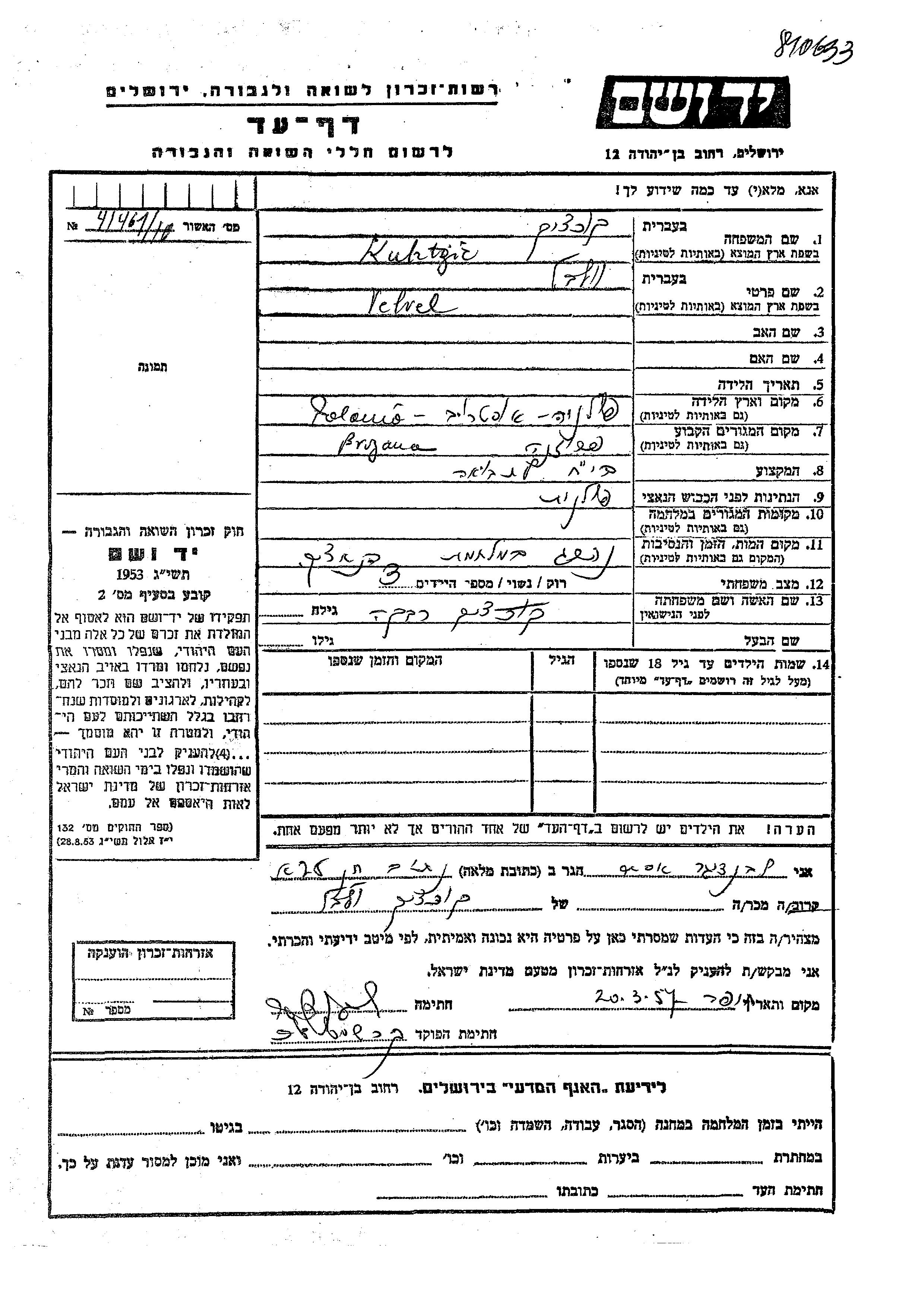 Velvel Kuhtzic Kurchik wurde in Ostrow Lubelski, Polen geboren. Er war בית חרושת לתבואה und mit Rivka Verheiratet. Vor dem Zweiten Weltkrieg lebte er in Pruzana, Polen.
