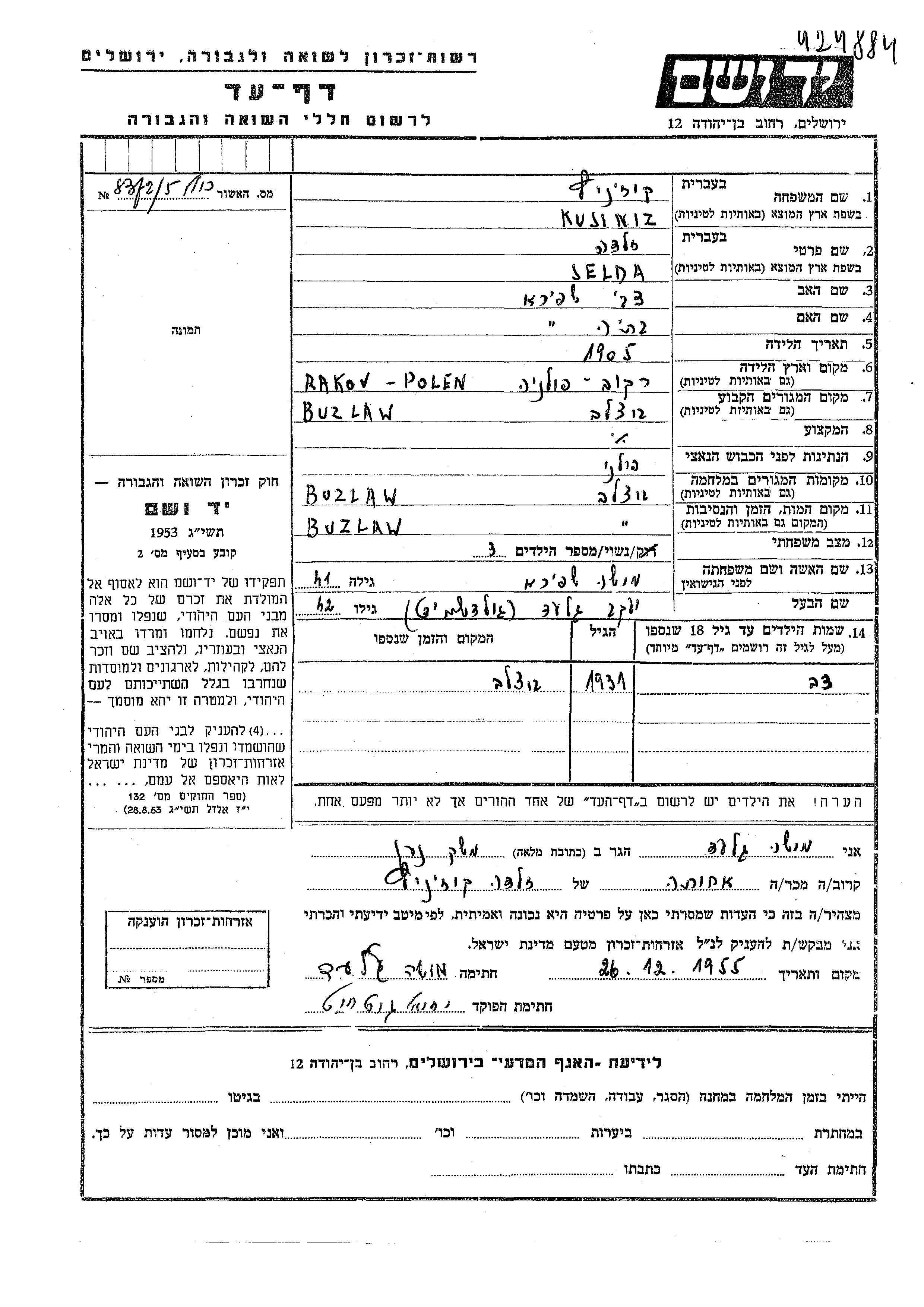 Selda Kusiniz, geb. Shapira wurde im Jahr 1905 in Rakov, Polen geboren. Sie war die Tochter von Tzvi und Batia. Sie war Verheiratet. Vor dem Zweiten Weltkrieg lebte sie in Budslaw, Polen. Während des Krieges war sie in Budslaw, Polen.