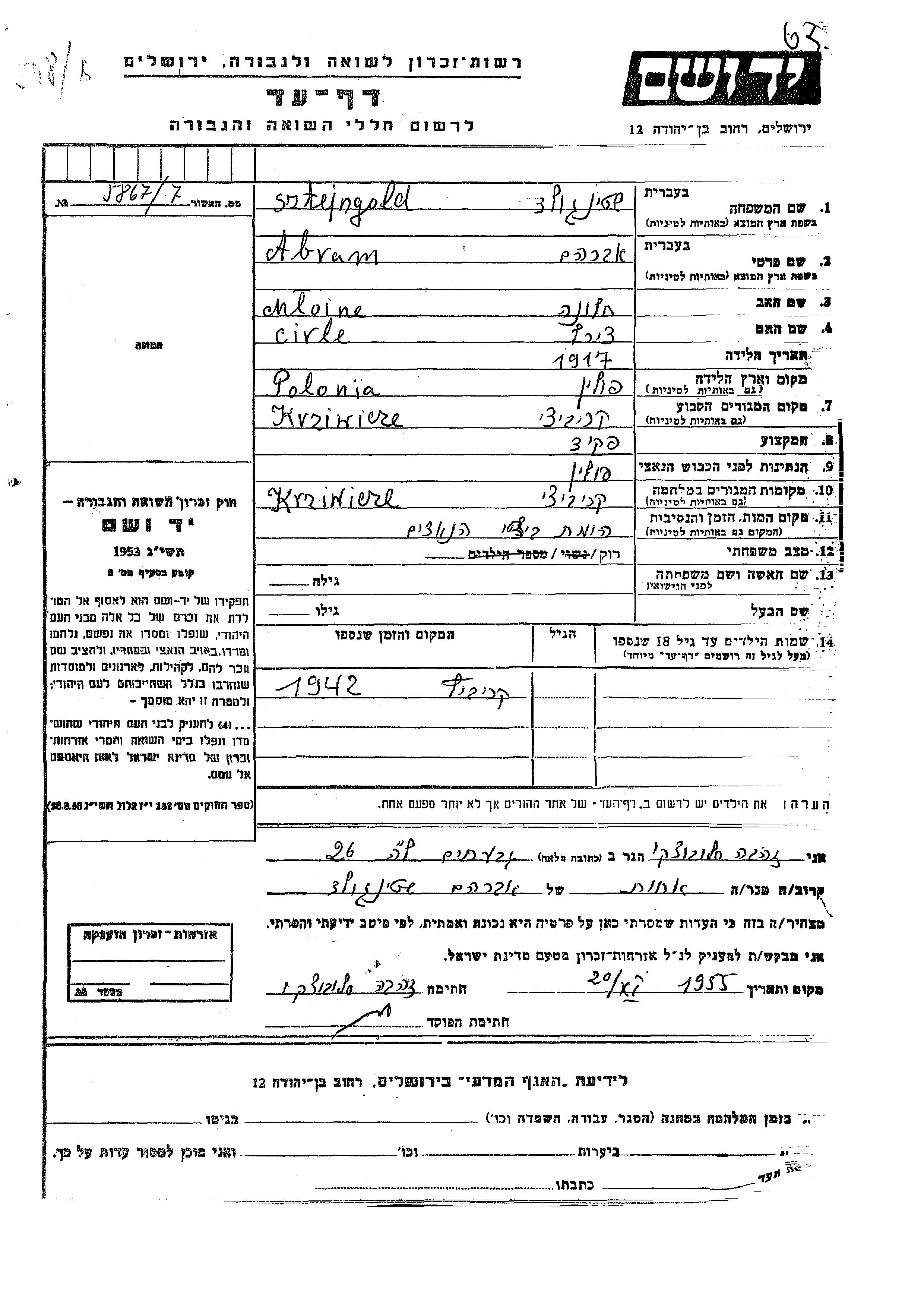 Sztejngold Abram 1917 Krzywicze, Polen Gedenkblatt