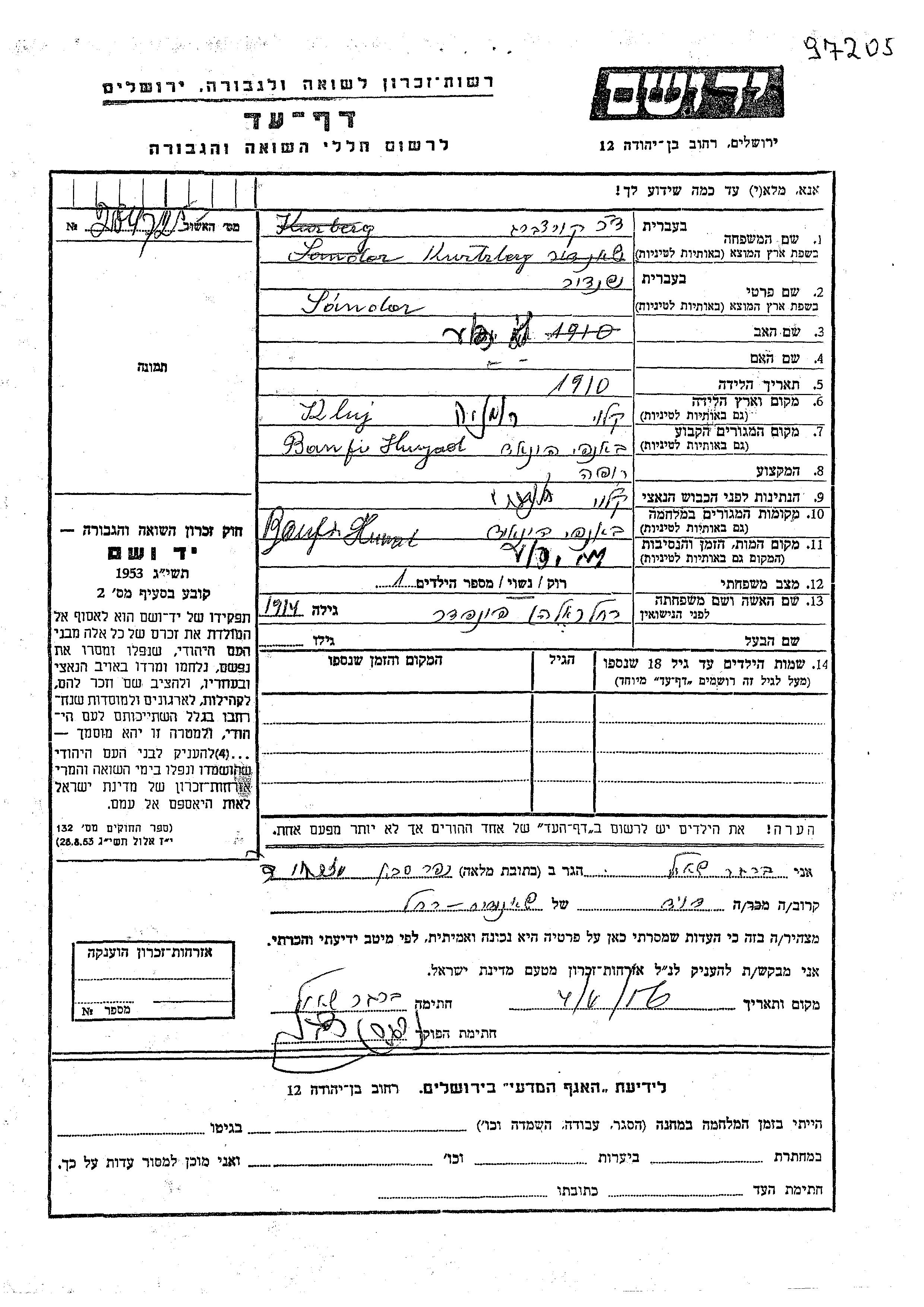 Dr. Sandor Kurtzberg wurde im Jahr 1910 in Cluj, Rumänien geboren. Er war Arzt/ärztin und mit Rakhel, geb. Fonfeder Verheiratet. Vor dem Zweiten Weltkrieg lebte er in Banfi-Hunyad, Rumänien. Während des Krieges war er in Banfi-Hunyad, Rumänien.