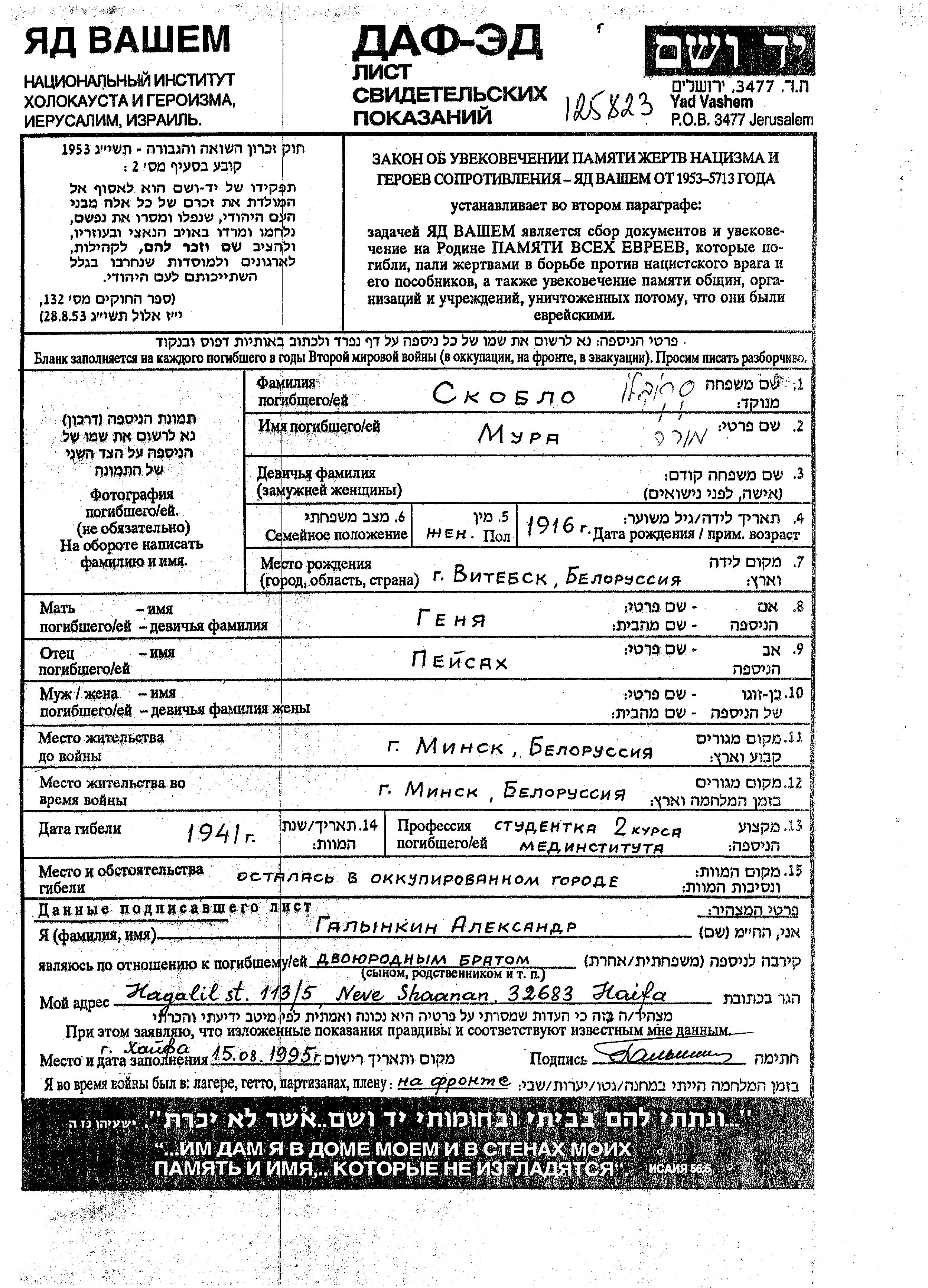 Mura Skoblo wurde im Jahr 1916 in Vitebsk, Weißrussland (UdSSR) geboren. Sie war die Tochter von Pesakh und Genia. Sie war Medizinstudent/-in. Vor dem Zweiten Weltkrieg lebte sie in Minsk, Weißrussland (UdSSR). Während des Krieges war sie in Minsk, Weißrussland (UdSSR).