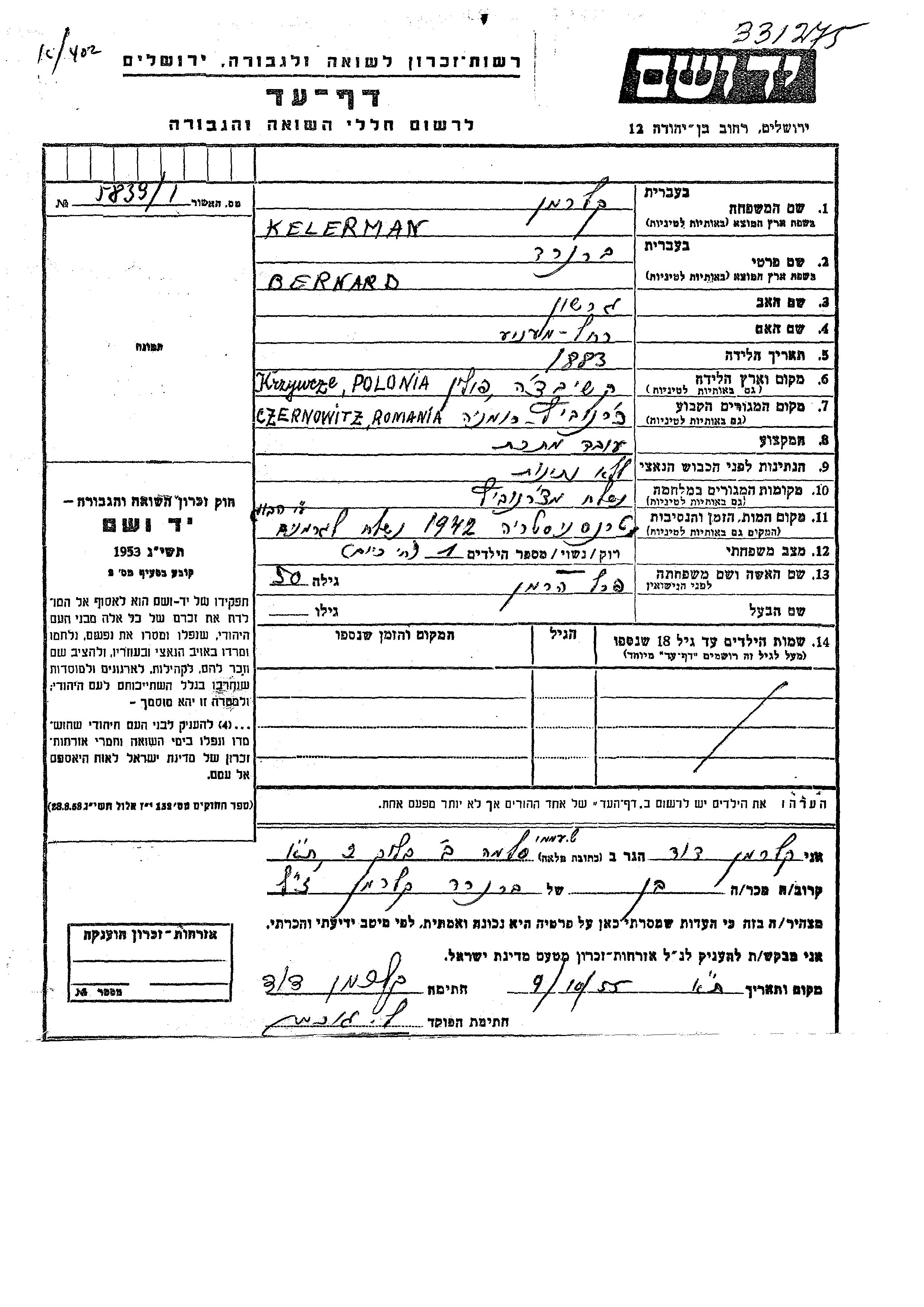 Bernard Kelerman wurde im Jahr 1883 in Krzywcze, Polen geboren. Er war der Sohn von Gershon und Rakhel Menukha. Er war mit Perel, geb. Herman Verheiratet. Vor dem Zweiten Weltkrieg lebte er in Czernowitz, Rumänien. Während des Krieges war er in Czernowitz, Rumänien.