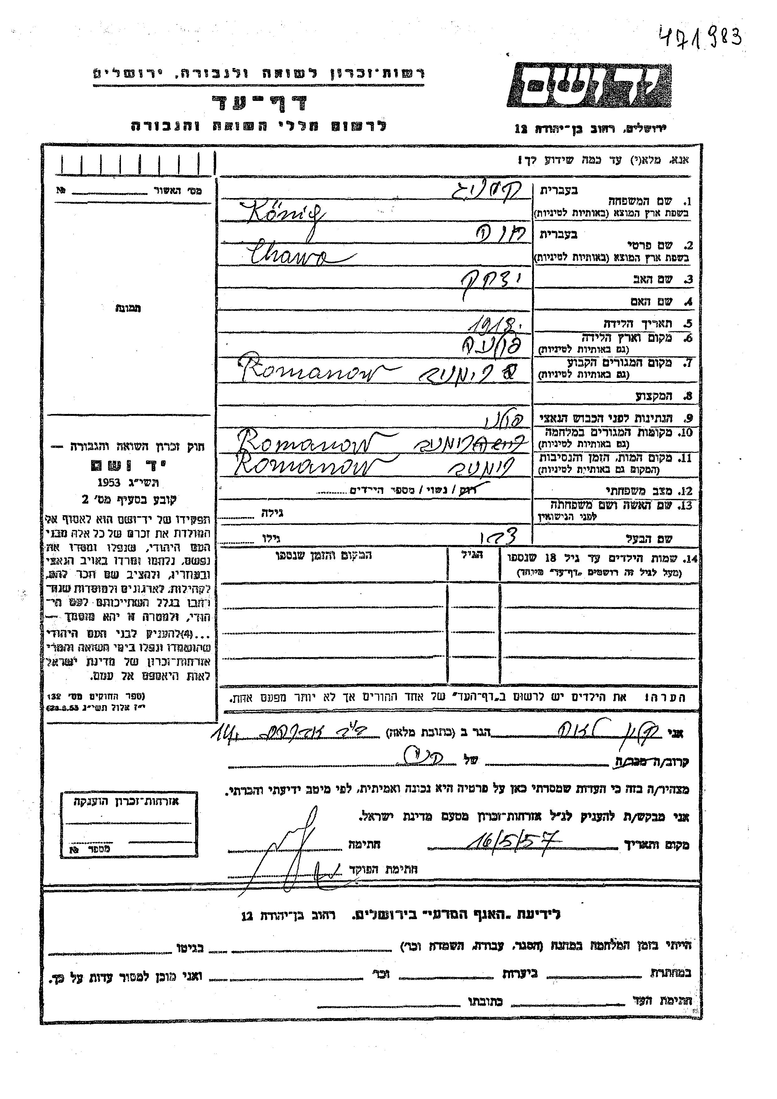Chawa König wurde im Jahr 1918 in Polen geboren. Sie war die Tochter von Yitzkhak. Sie war mit Tzvi Verheiratet. Vor dem Zweiten Weltkrieg lebte sie in Romanow, Polen. Während des Krieges war sie in Romanow, Polen.