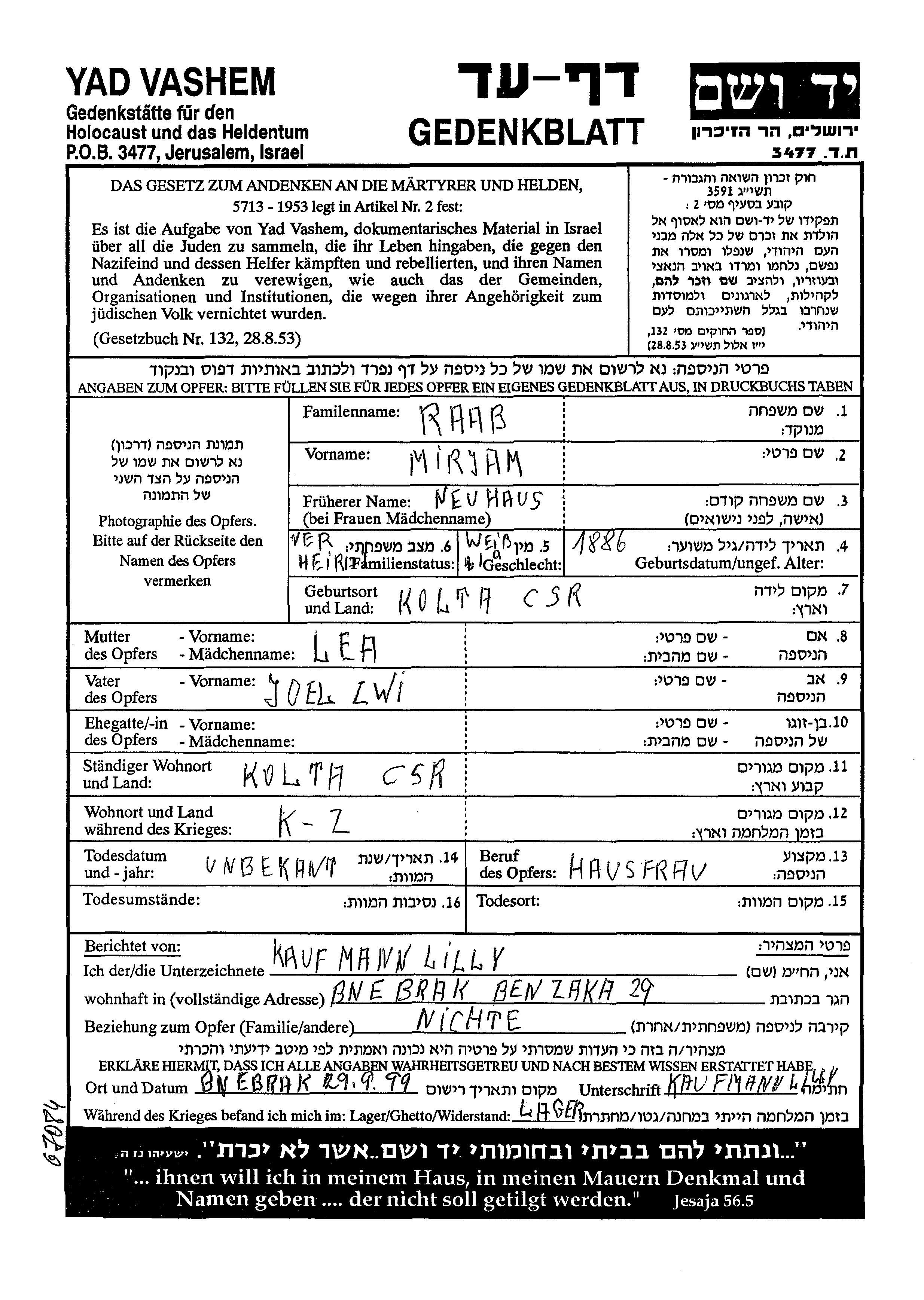 Miriam Rab Raw, geb. Neuhaus wurde im Jahr 1886 in Tschechoslowakei geboren. Sie war Hausfrau. Vor dem Zweiten Weltkrieg lebte sie in Kolta, Tschechoslowakei.