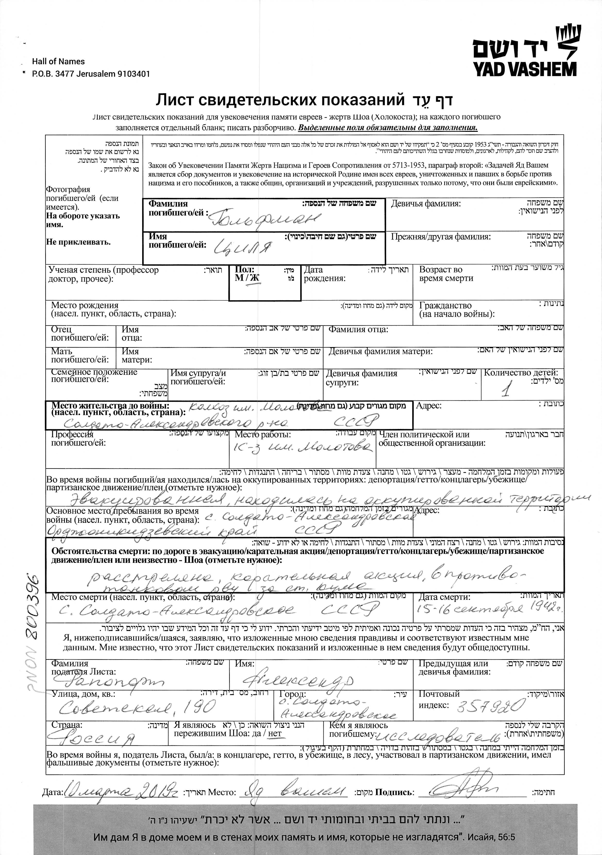 Tzilya Golfman. Vor dem Zweiten Weltkrieg er/sie in Soldato Aleksandrovskoye, Russland (UdSSR). Tzilya wurde in der Schoah ermordet. Todesort: Soldato Aleksandrovskoye, Russland (UdSSR) im Jahr 15/09/1942.