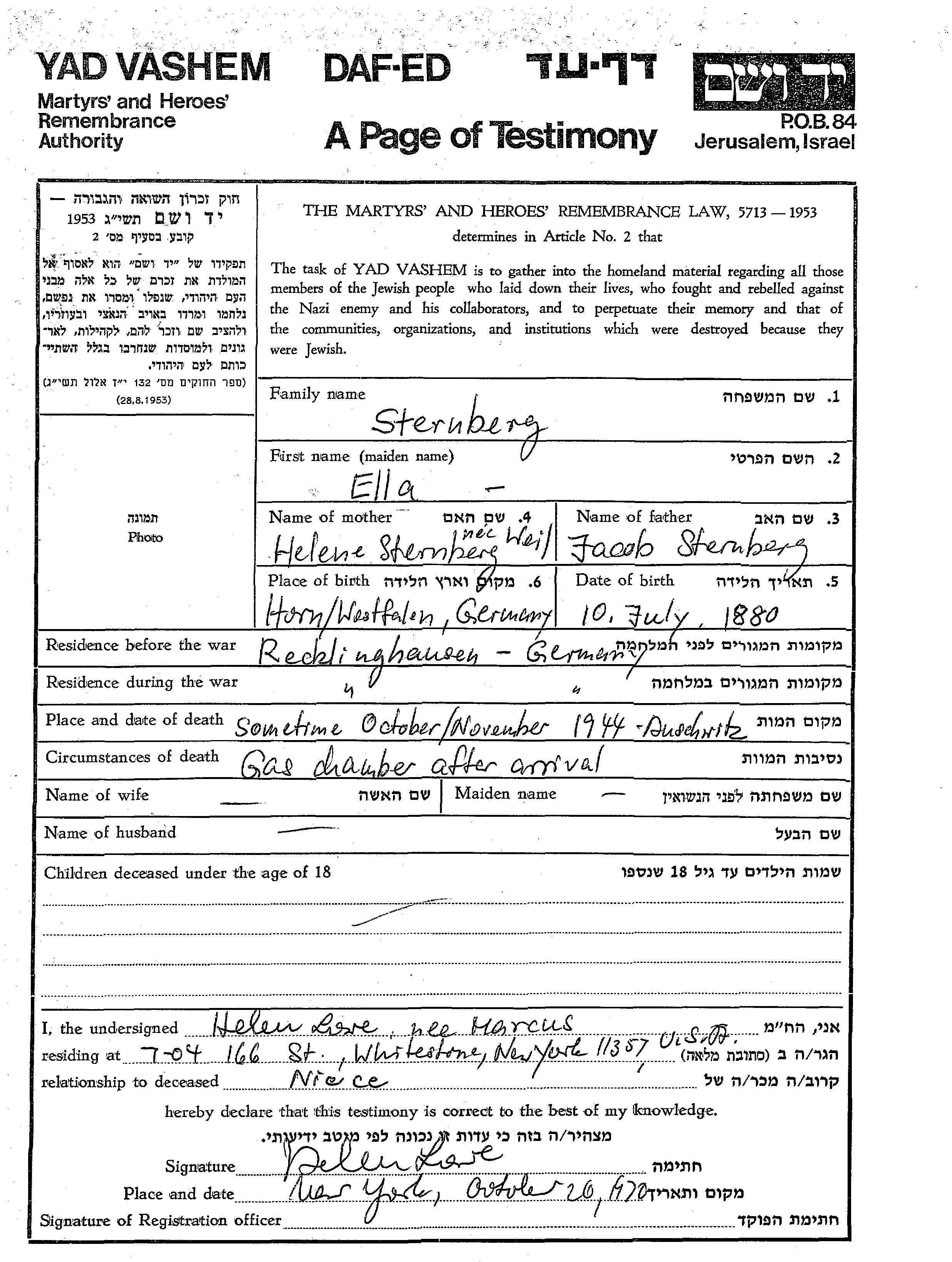 Ella wurde in der Schoah ermordet. Todesort: Auschwitz, Polen im Jahr 10/1944.