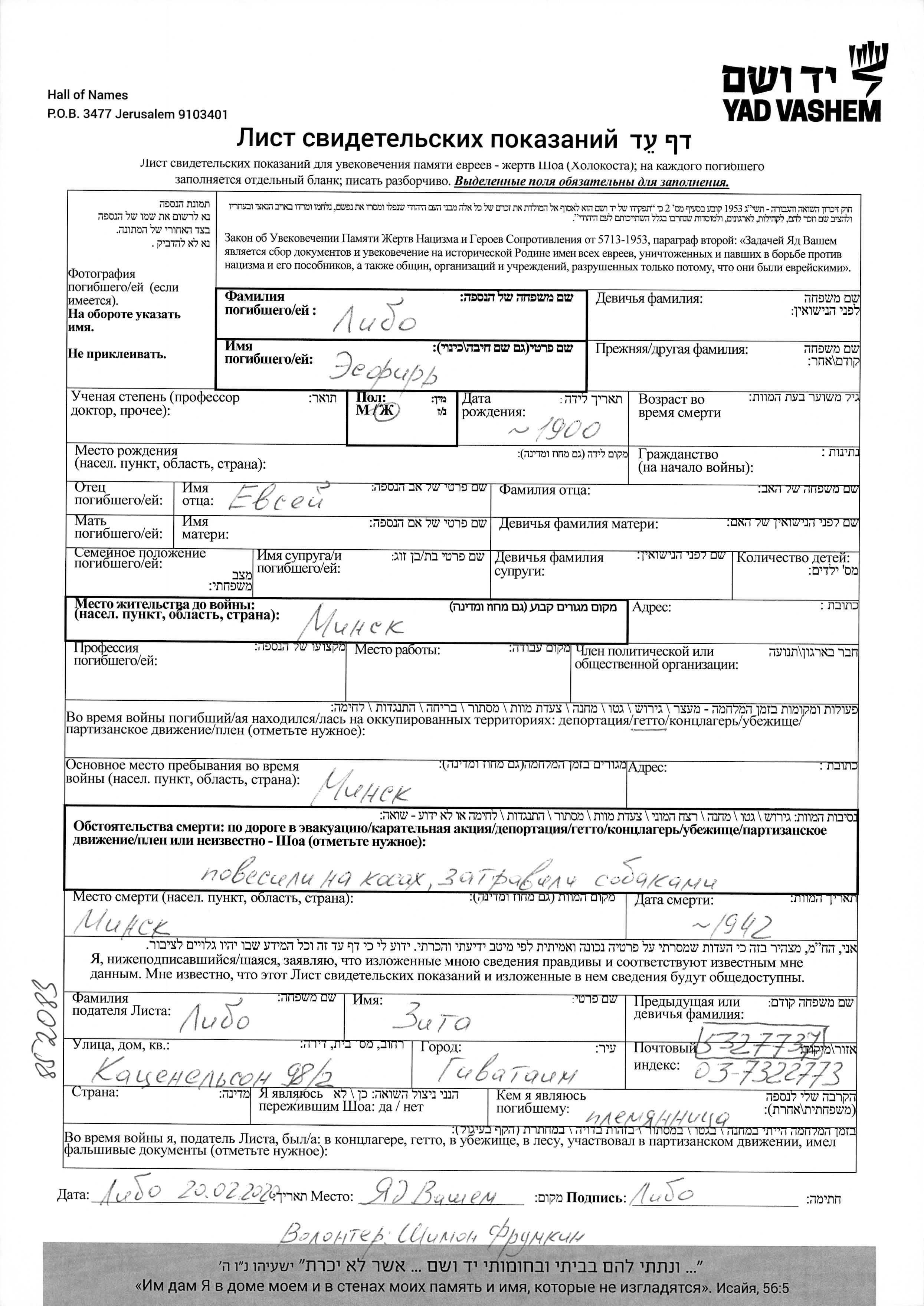 Suche nach einem Todesjahr im Zeitraum der Holocaust: 1933 bis 1945. Bitte wählen Sie 'Exakt' im Auswahlmenü, um nur nach einem einzelnen Jahr zu suchen, alternativ können Sie die flexibleren Optionen '+/- 2 Jahre' oder '+/- 5 Jahre' wählen.