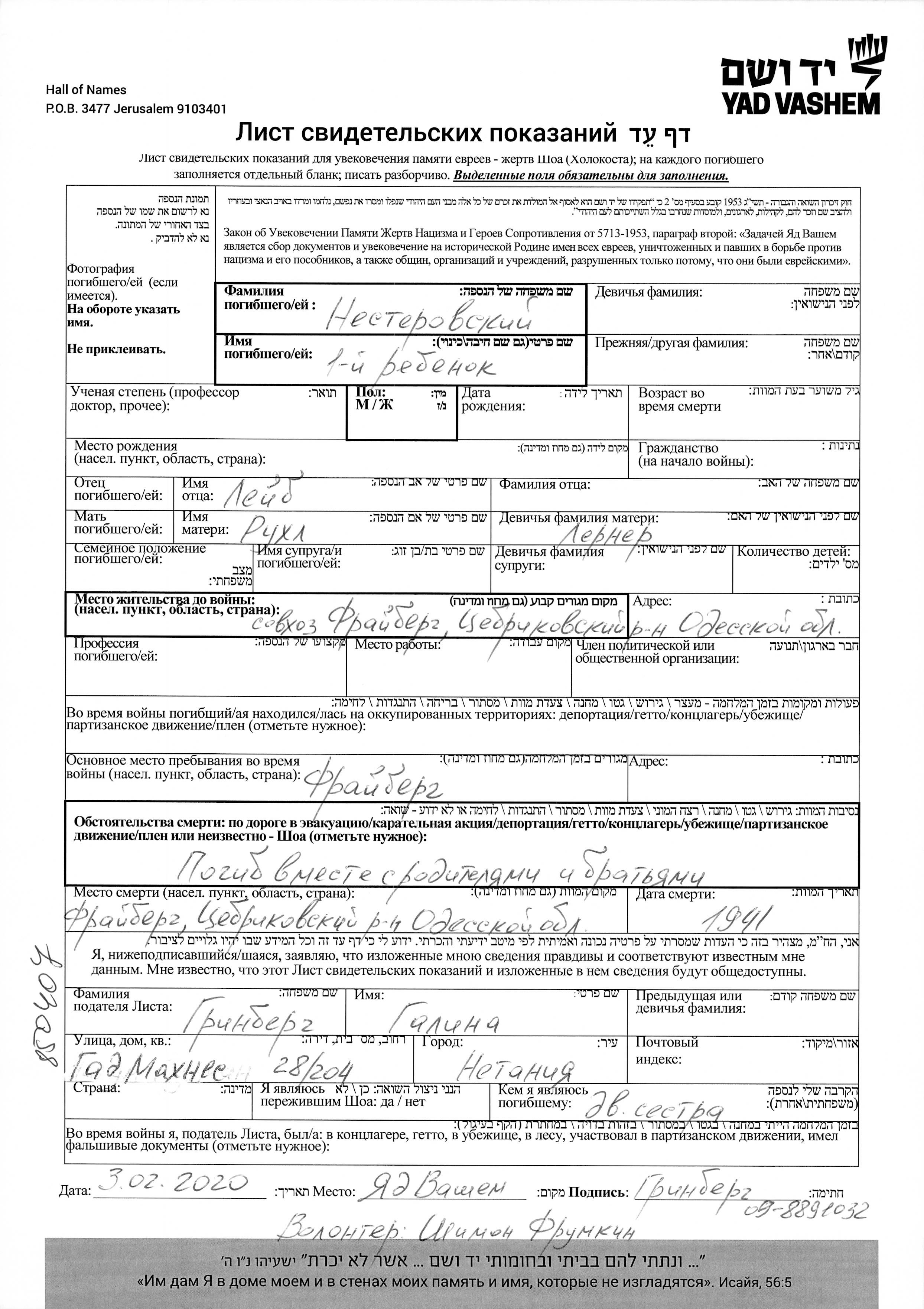 Vorname unbekannt Nesterovski wurde Er war der Sohn von Leyb und Rukhl, geb. Lerner. Vor dem Zweiten Weltkrieg lebte er in Frayberg, Ukraine (UdSSR). Während des Krieges war er in Frayberg, Ukraine (UdSSR).