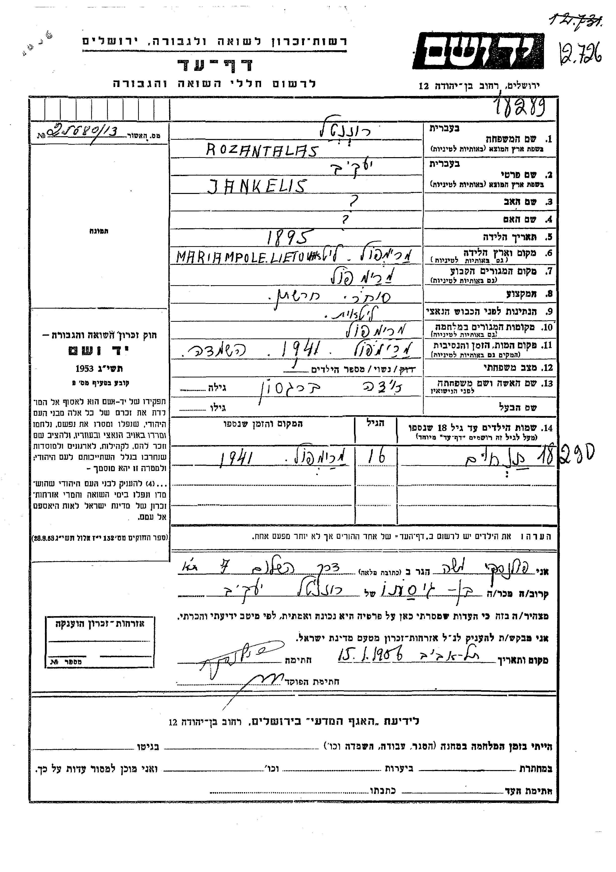 Jankelis Rozantalas wurde im Jahr 1895 in Mariampole, Litauen geboren. Er war Fabrikant/-in und mit Ida, geb. Bergson Verheiratet. Vor dem Zweiten Weltkrieg lebte er in Mariampole, Litauen. Während des Krieges war er in Mariampole, Litauen.