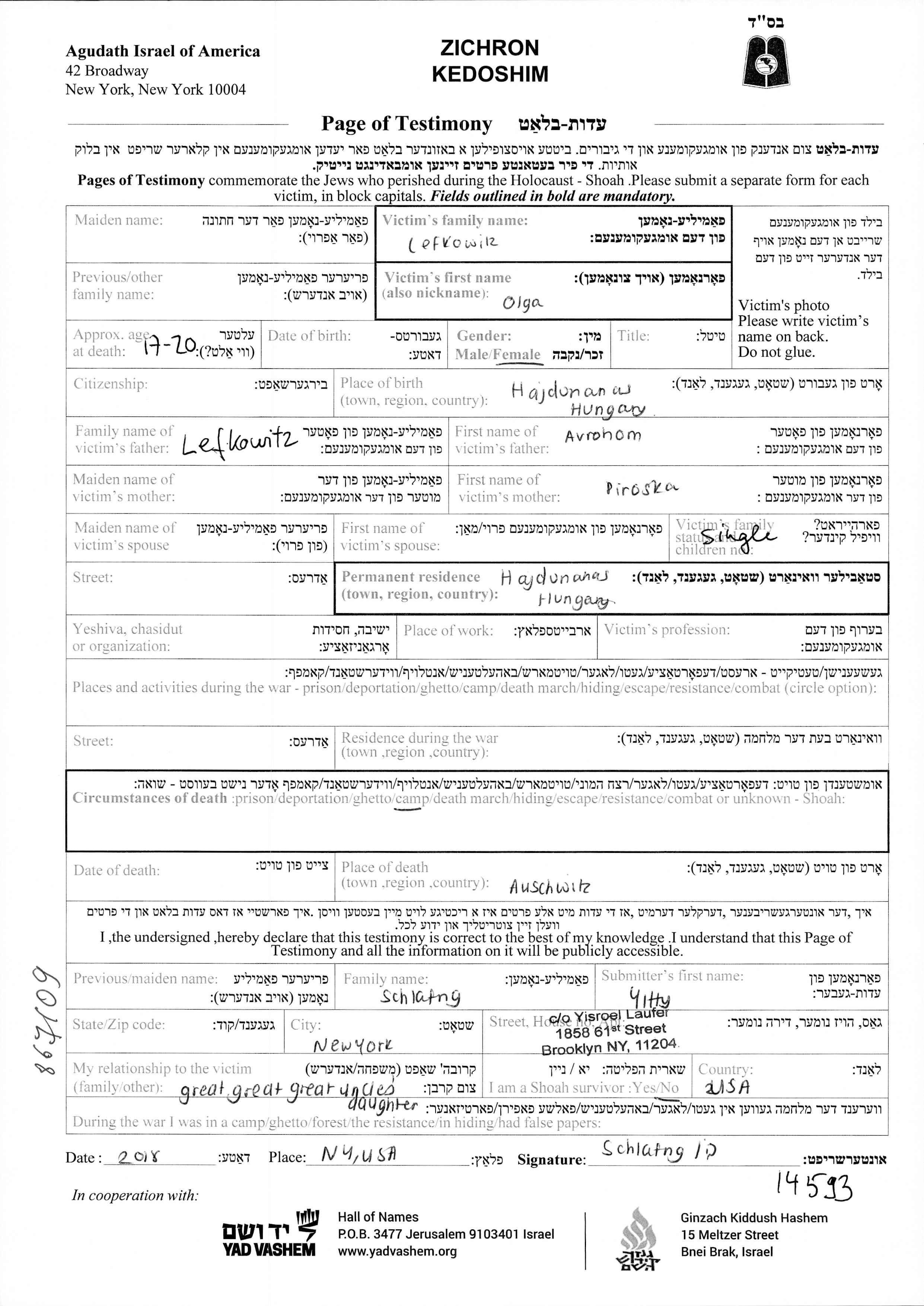 Olga Lefkowitz wurde in Hajdunanas, Ungarn geboren. Sie war die Tochter von Avrohom und Piroska. Sie war Ledig. Vor dem Zweiten Weltkrieg lebte sie in Hajdunanas, Ungarn.