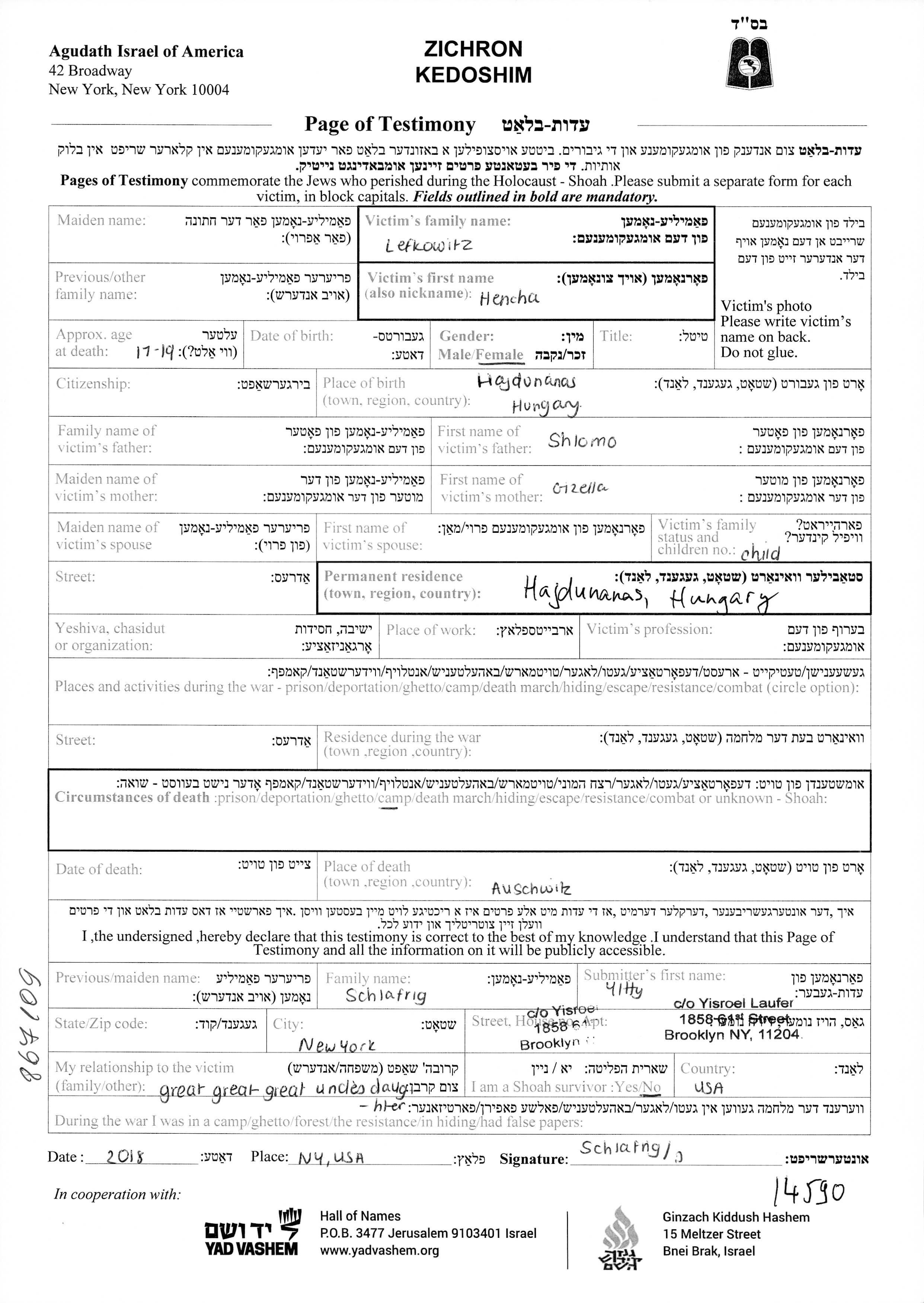 Hencha Lefkowitz wurde in Hajdunanas, Ungarn geboren. Sie war die Tochter von Shlomo und Gizella. Vor dem Zweiten Weltkrieg lebte sie in Hajdunanas, Ungarn.
