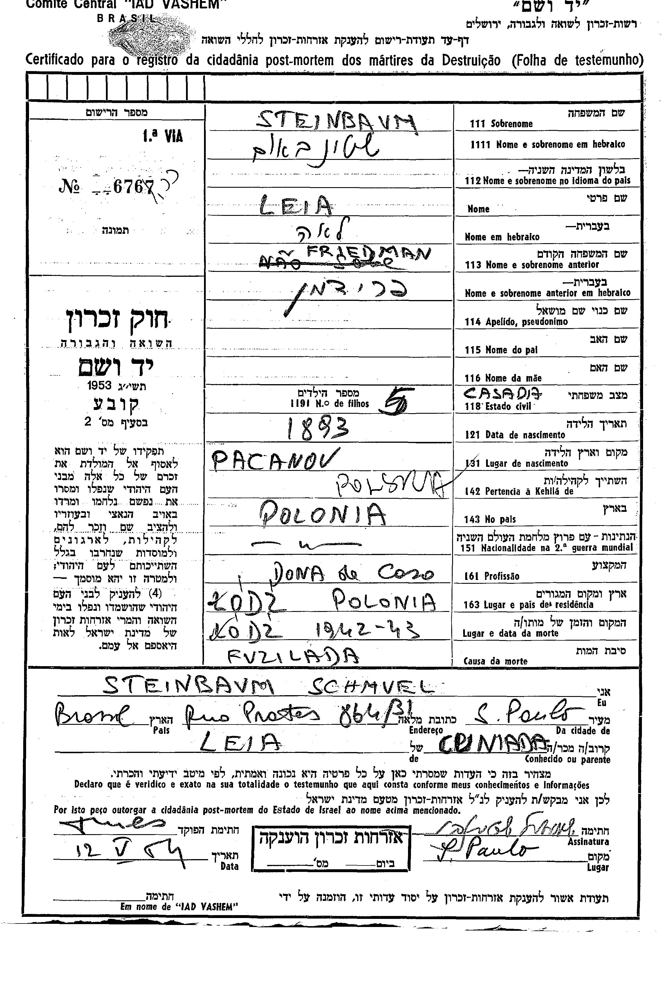 Lea Steinbaum, geb. Friedman wurde im Jahr 1890 in Pacanow, Polen geboren. Sie war Hausfrau. Vor dem Zweiten Weltkrieg lebte sie in Lodz, Polen.