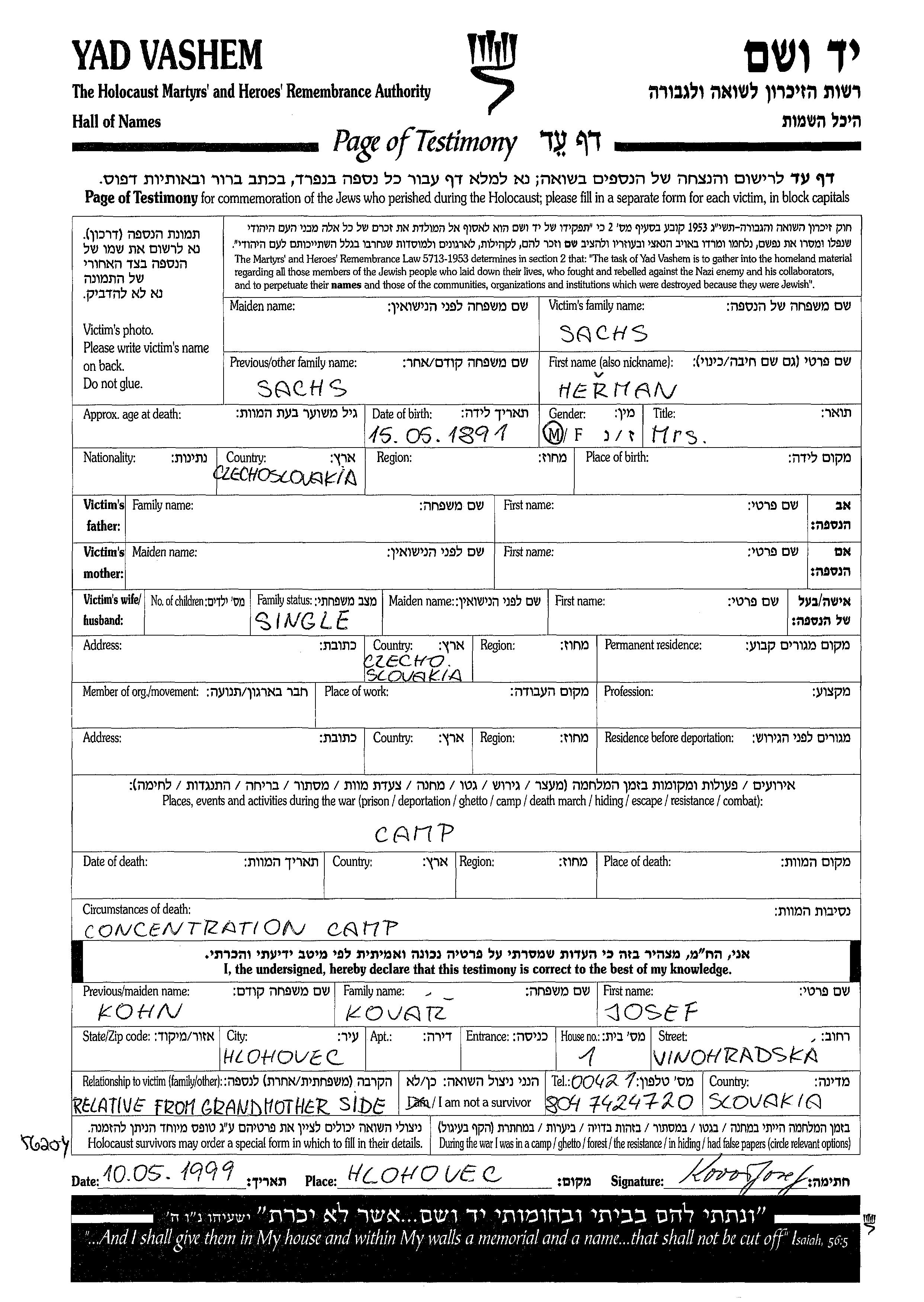 Herman Sachs wurde im Jahr 1891 in Tschechoslowakei geboren. Vor dem Zweiten Weltkrieg lebte er in Tschechoslowakei.
