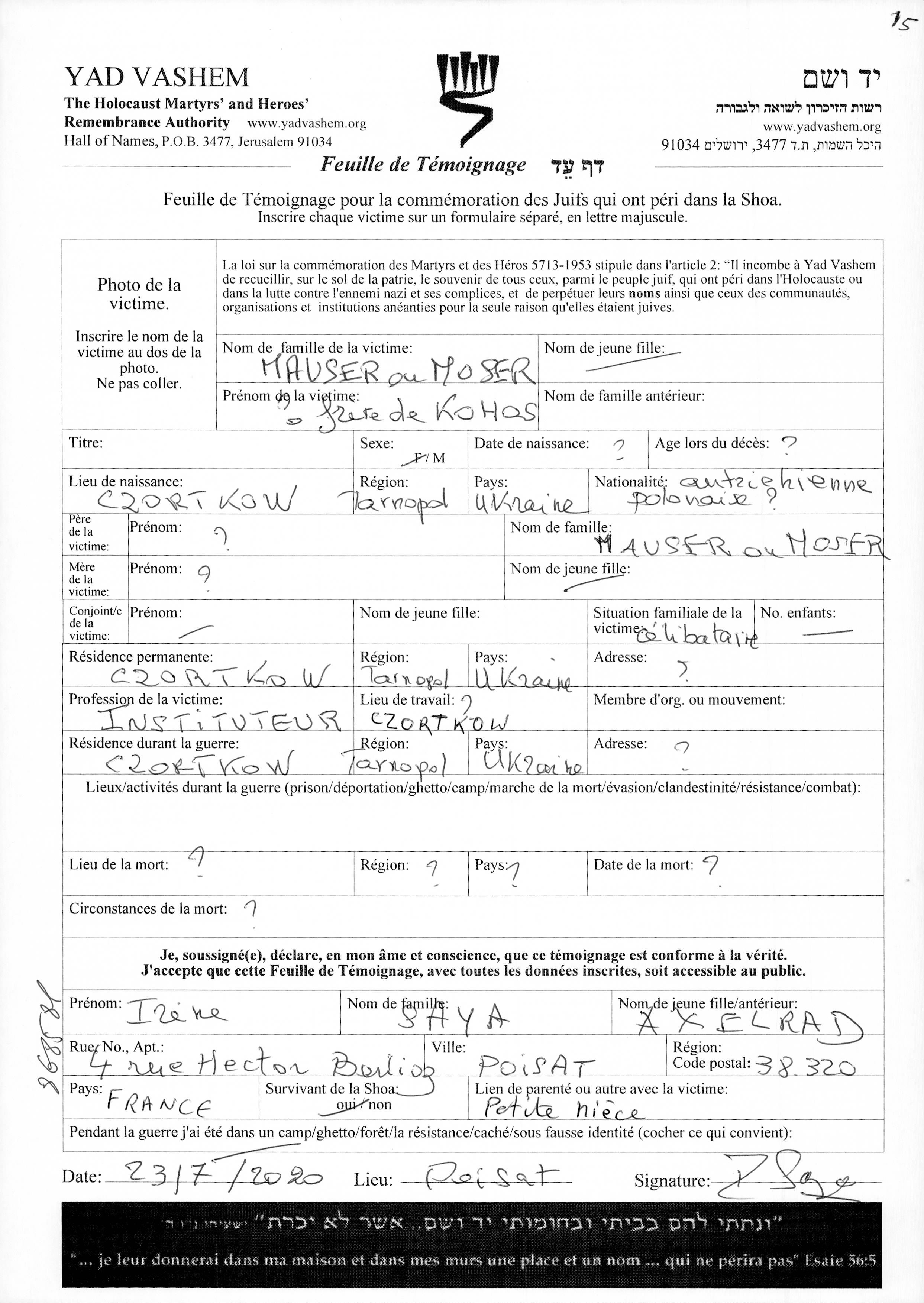 Szere Mauser Moser wurde in Czortkow, Polen geboren. Er war Lehrer/in und Ledig. Vor dem Zweiten Weltkrieg lebte er in Czortkow, Polen. Während des Krieges war er in Czortkow, Polen.