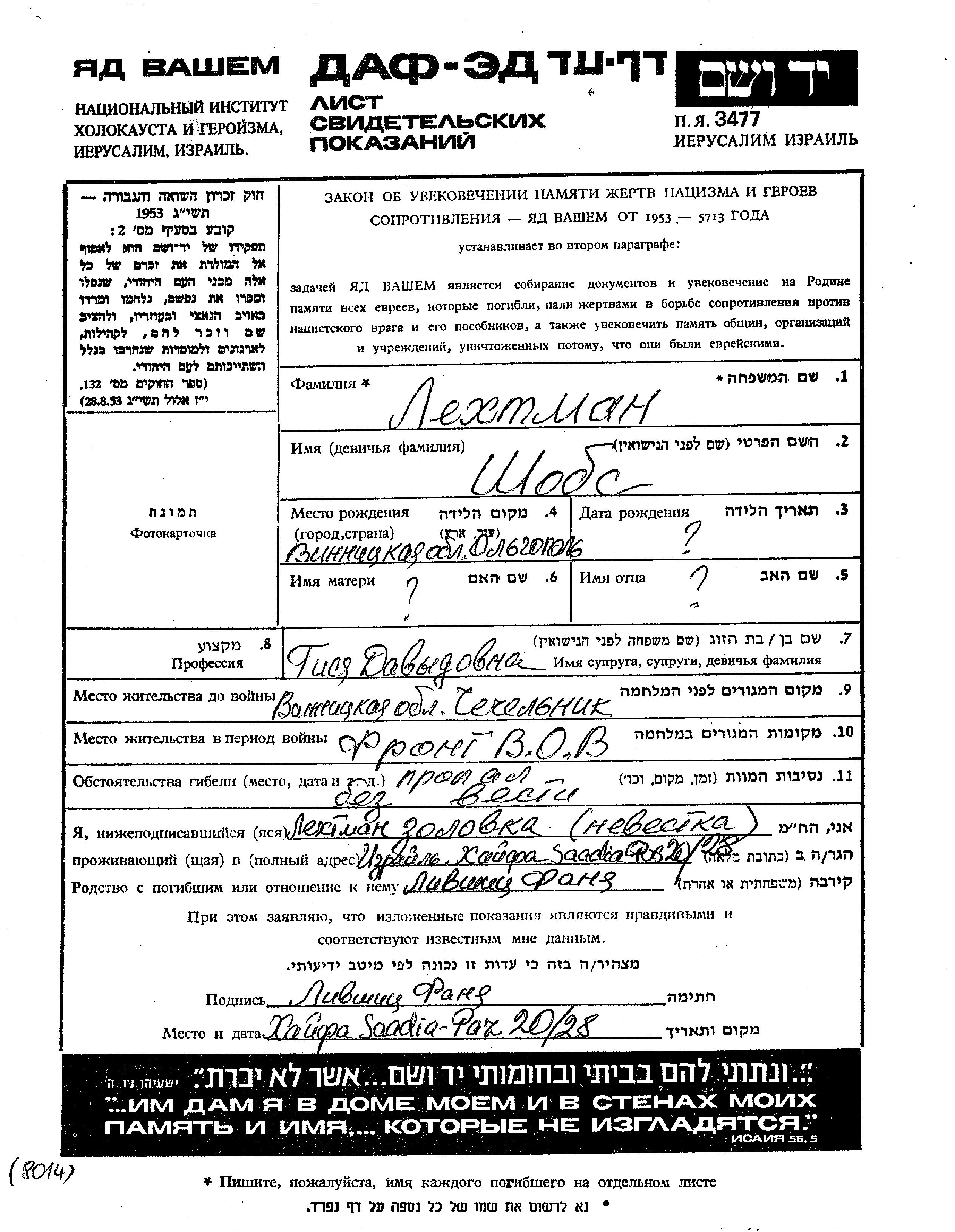 Lekhtman | Shobs | Chechelnik, Ukraine (UdSSR) | Gedenkblatt | |