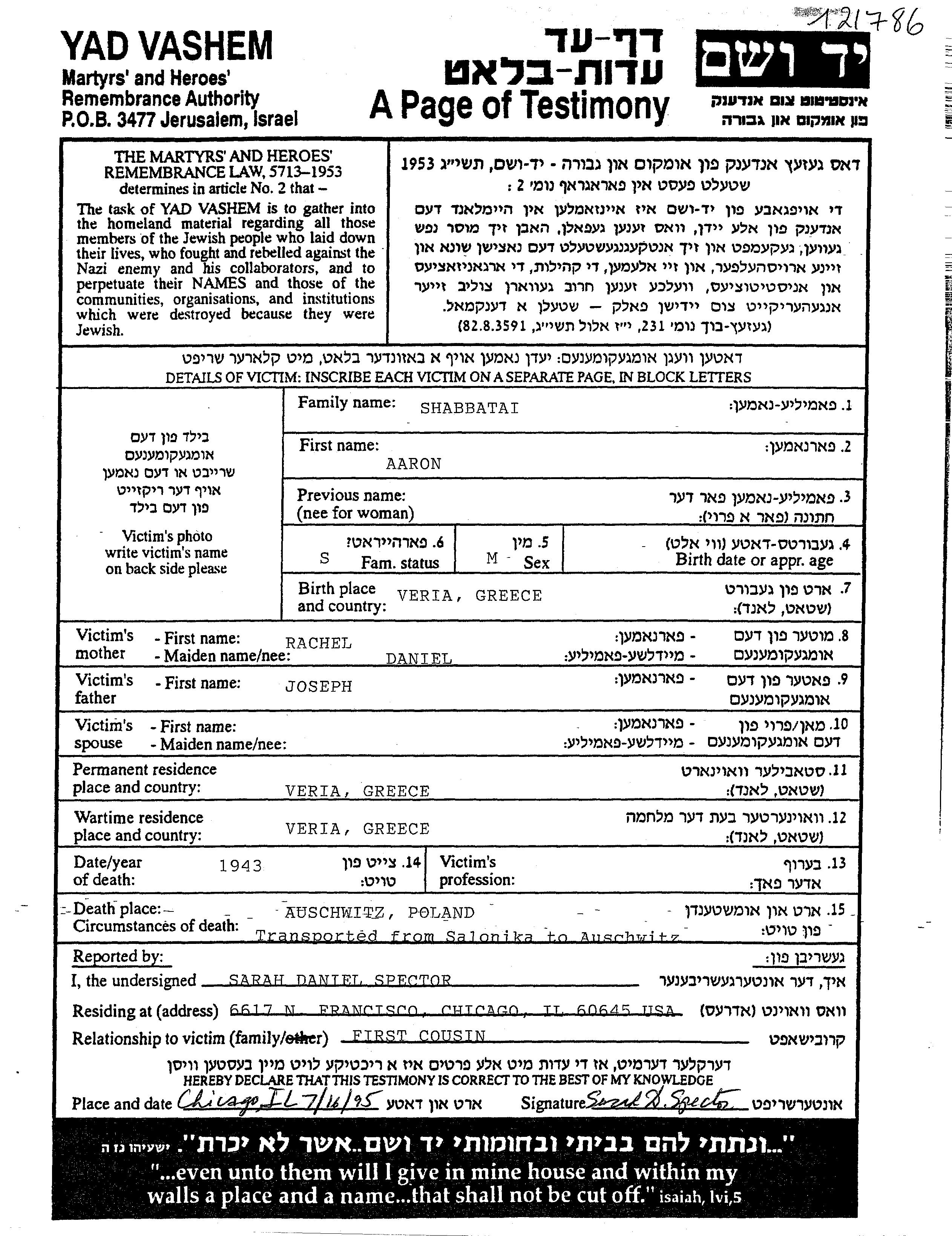 Shabbetay Aaron 1921 Veria, Griechenland Gedenkblatt