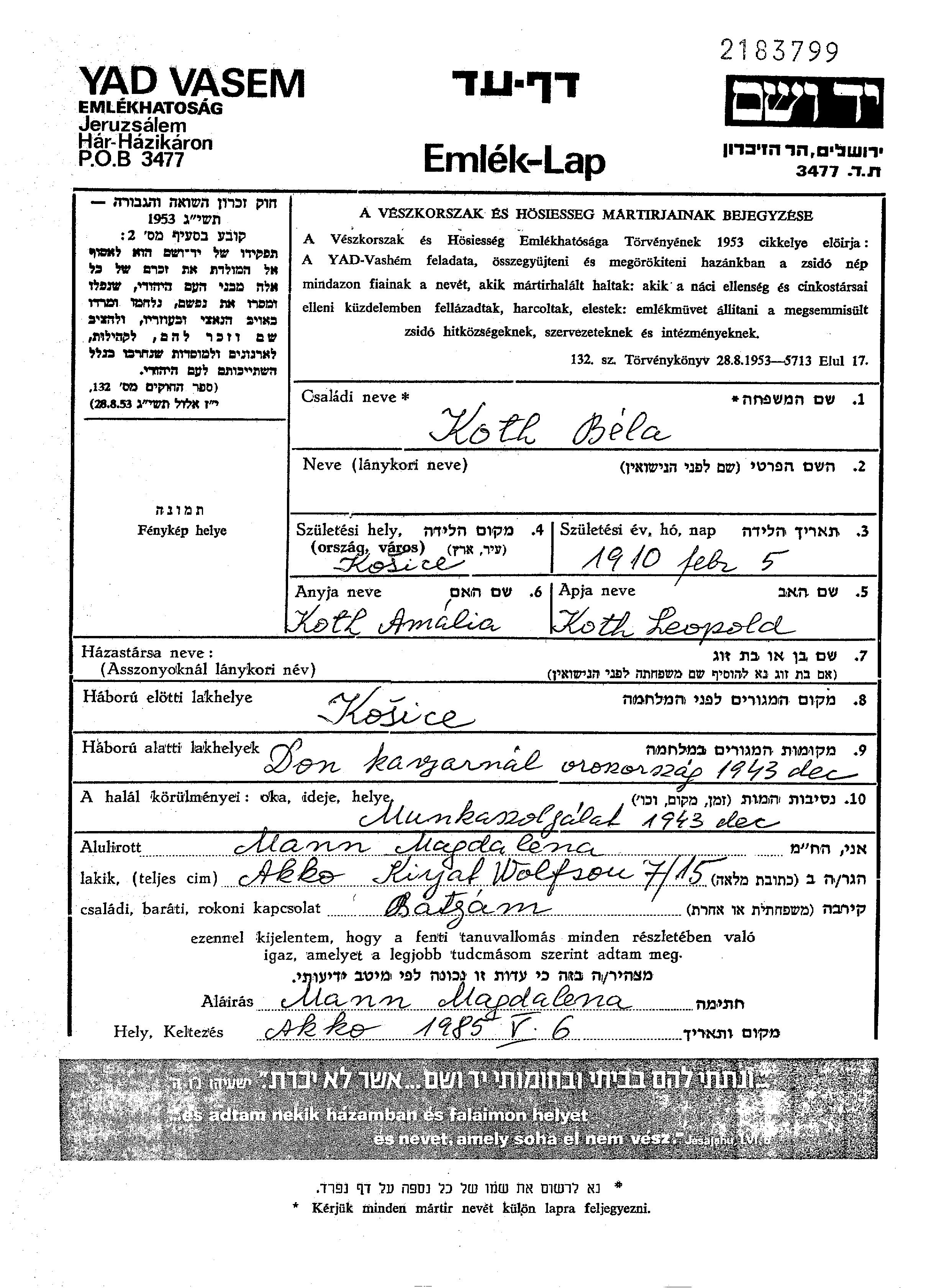 Koth | Bela | 1910 | Kassa, | Liste von Opfern in ungarischen Arbeitskommandos |