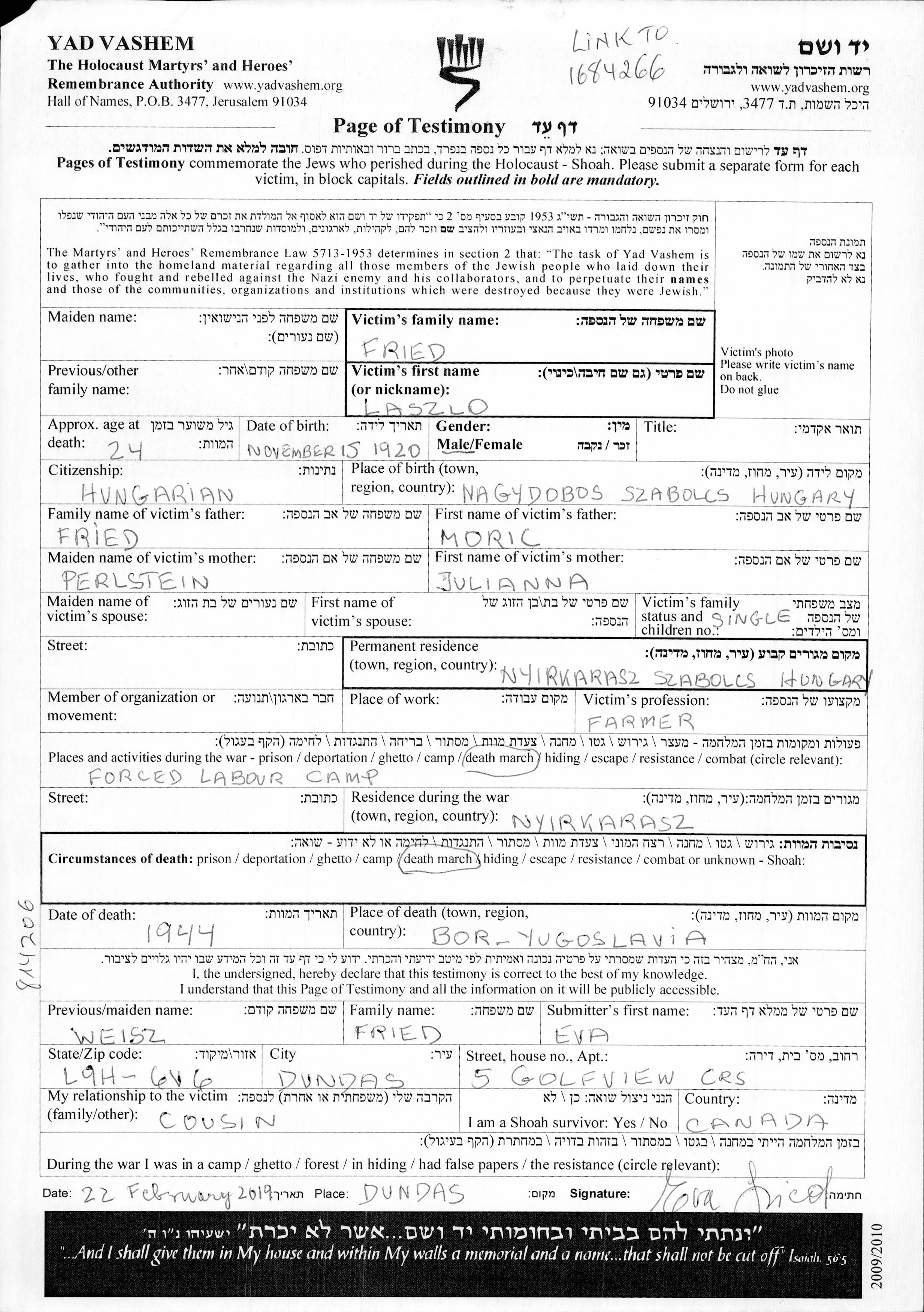 László Fried wurde im Jahr 1920 in unbekannter Ort geboren. Er war Landwirt. Vor dem Zweiten Weltkrieg lebte er in Nyirkarasz, Ungarn.