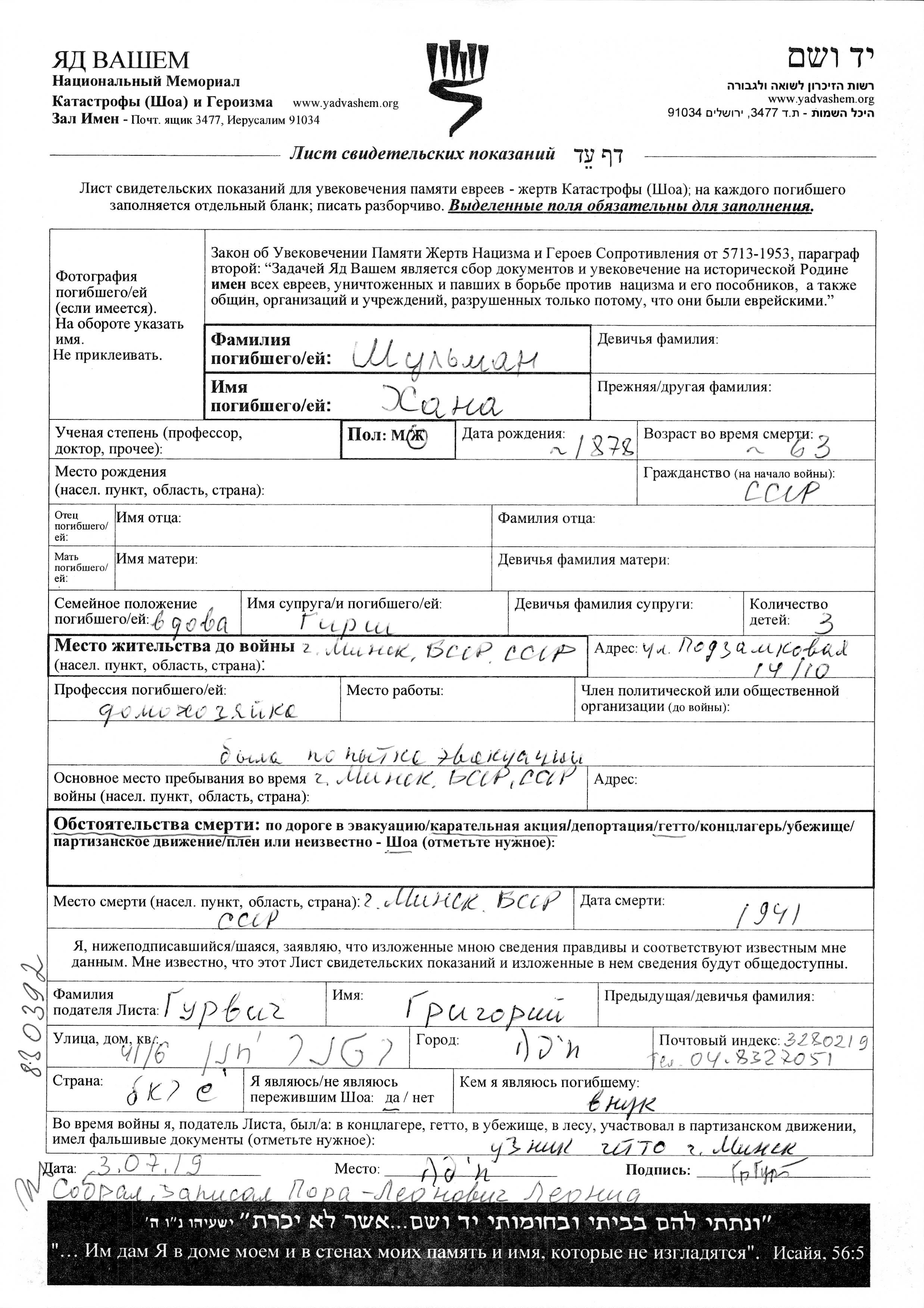 Khana Shulman wurde im Jahr 1878 geboren. Sie war Hausfrau und mit Girsh Witwe. Vor dem Zweiten Weltkrieg lebte sie in Minsk, Weißrussland (UdSSR). Während des Krieges war sie in Minsk, Weißrussland (UdSSR).