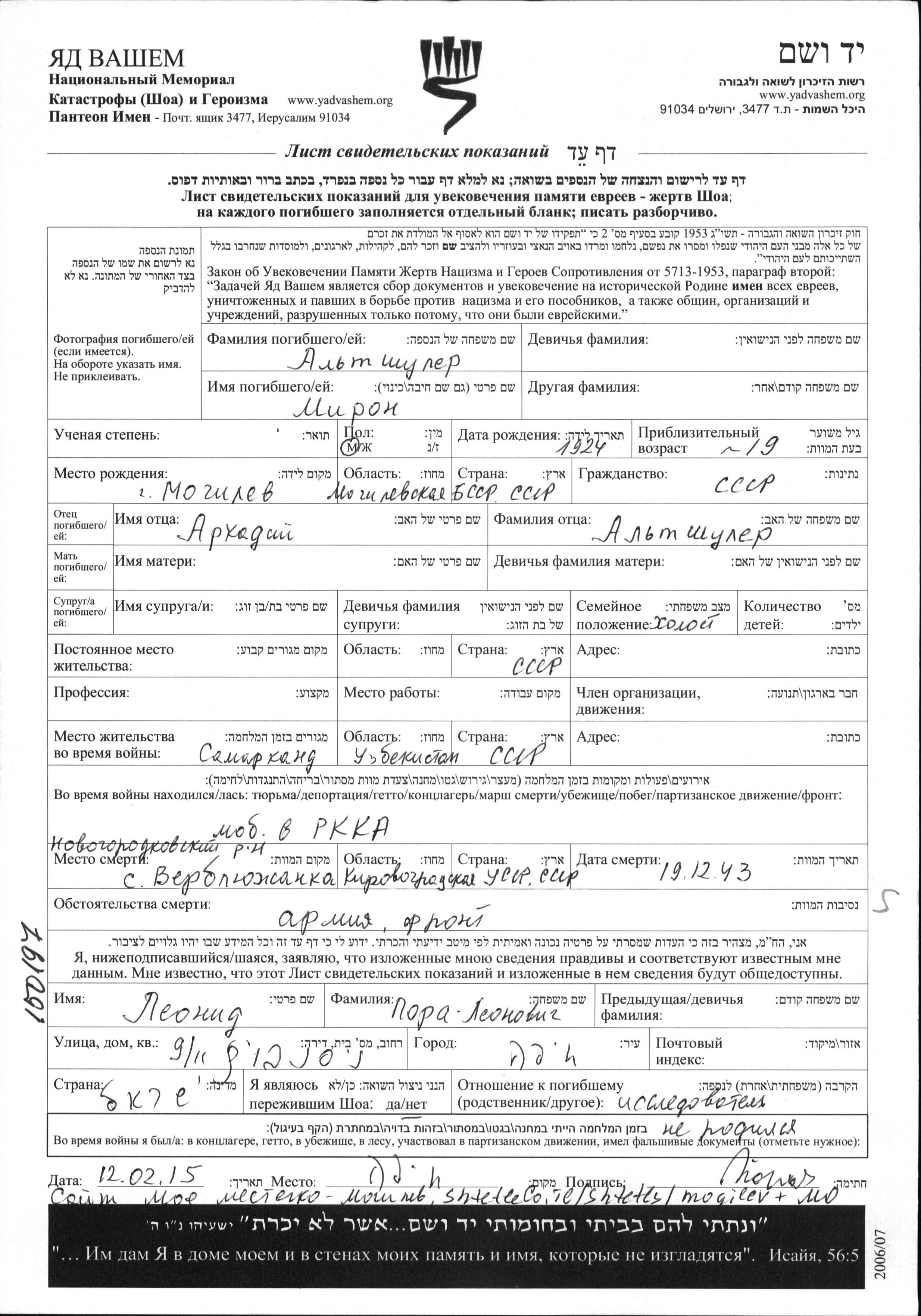 Miron im Militärdienst umgekommen. Todesort: unbekannter Ort im Jahr 19/12/1943.