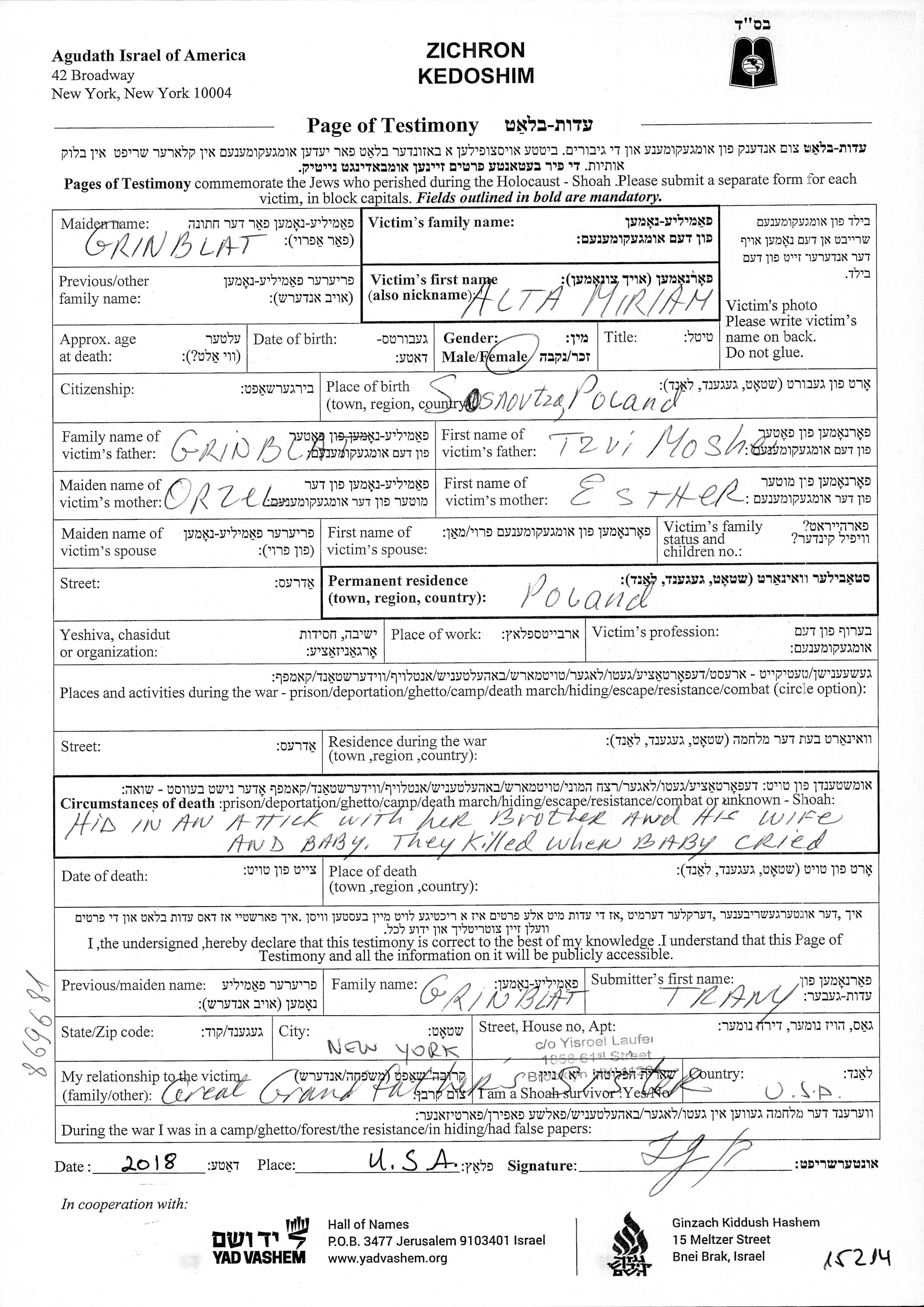 Alta Miriam Name unbekannt, geb. Grinblat wurde in Sosnowice, Polen geboren. Sie war die Tochter von Tzvi Moshe und Esther, geb. Orzel. Vor dem Zweiten Weltkrieg lebte sie in Polen.