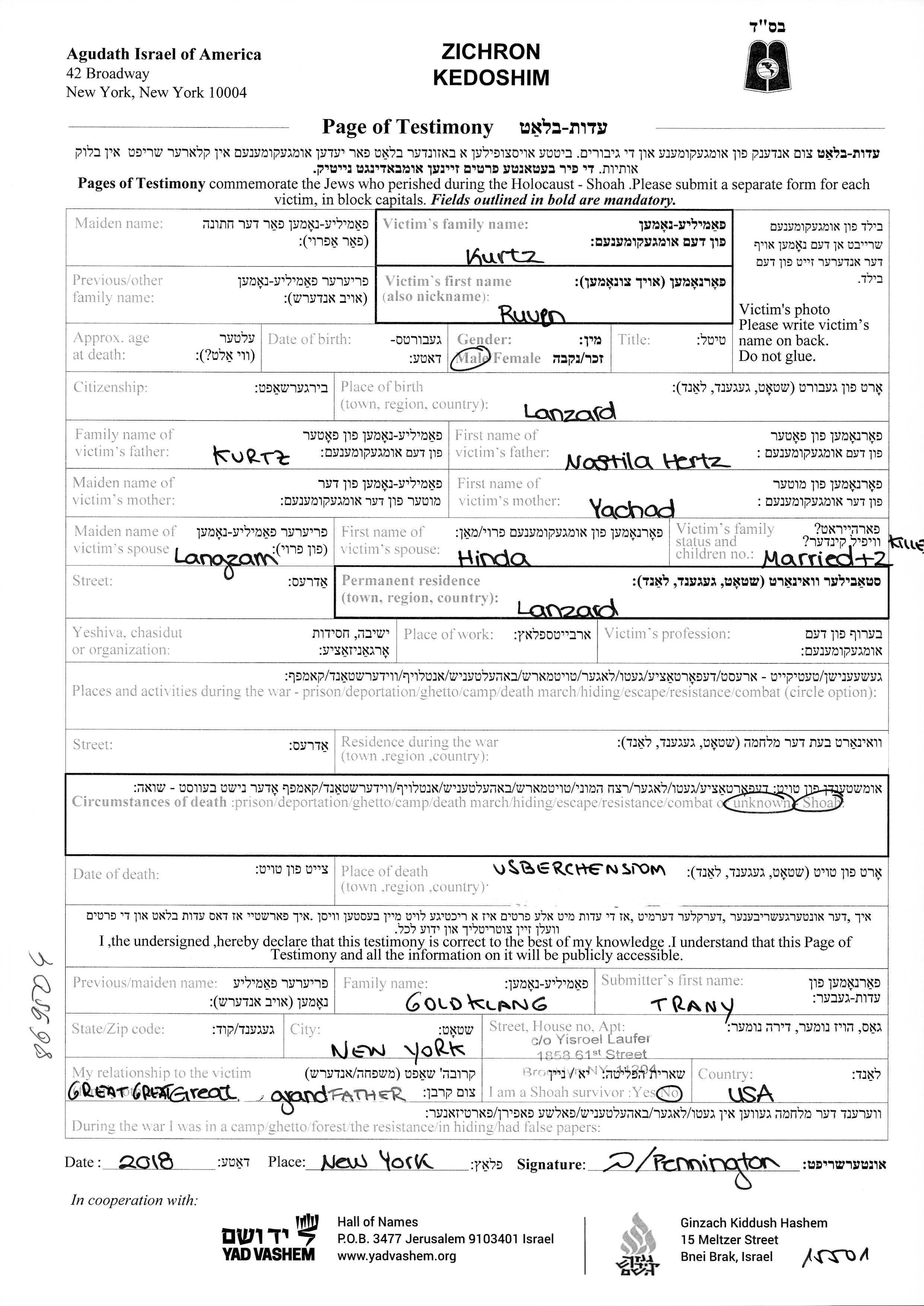Ruven Kurtz wurde in Lancut, Polen geboren. Er war der Sohn von Naftila Hertz und Yachad. Er war mit Hinda, geb. Langzam Verheiratet. Vor dem Zweiten Weltkrieg lebte er in Lancut, Polen.