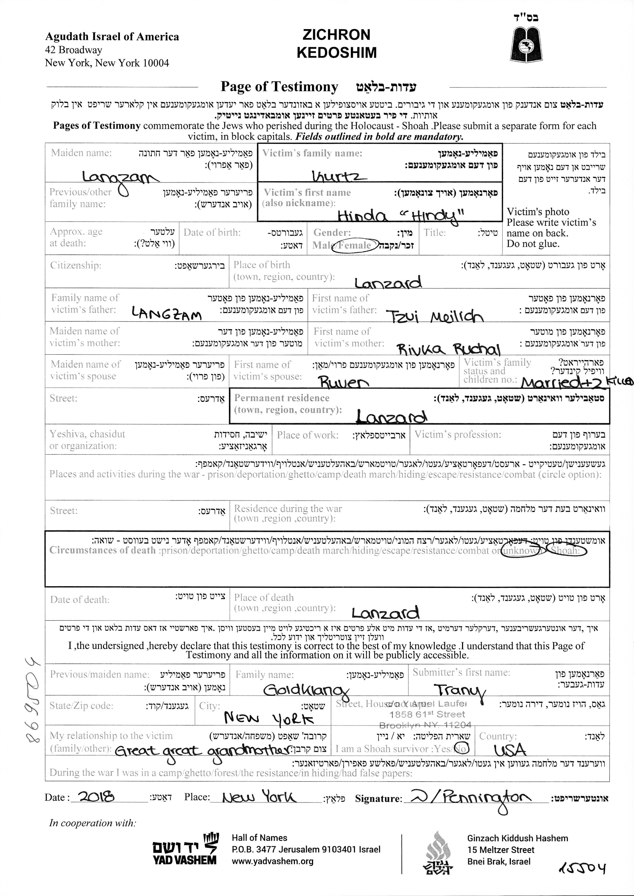 Hinda Kurtz, geb. Langzam wurde in Lancut, Polen geboren. Sie war die Tochter von Tzvi Meilich und Rivka Ruchal. Sie war mit Ruven Verheiratet. Vor dem Zweiten Weltkrieg lebte sie in Lancut, Polen.