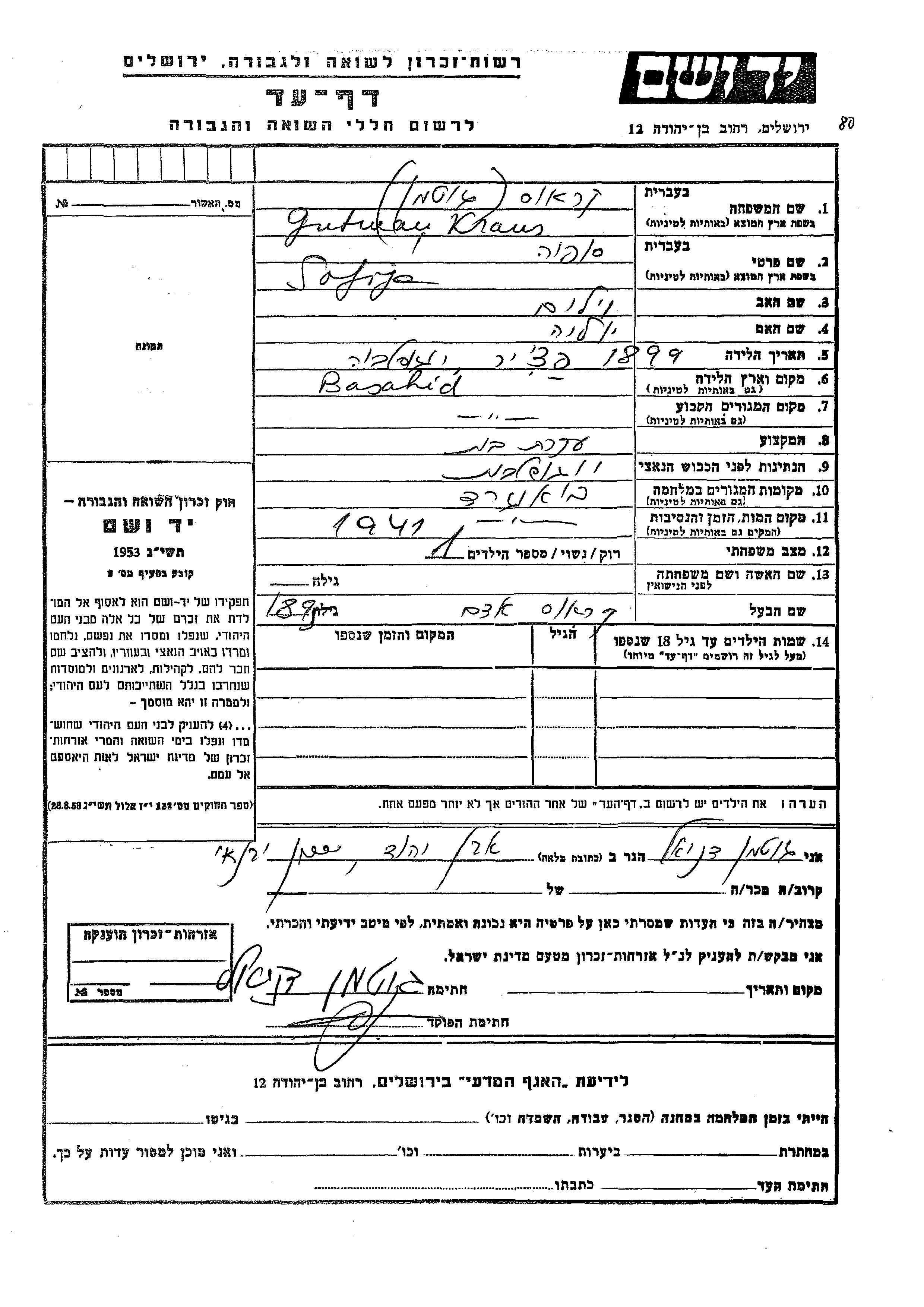 Sofiya Kraus, geb. Gutman wurde im Jahr 1899 in Basahid, Jugoslawien geboren. Sie war die Tochter von Vilhelm und Yulia. Sie war Hausfrau und mit Adam Verheiratet. Vor dem Zweiten Weltkrieg lebte sie in Basahid, Jugoslawien. Während des Krieges war sie in Beograd, Jugoslawien.