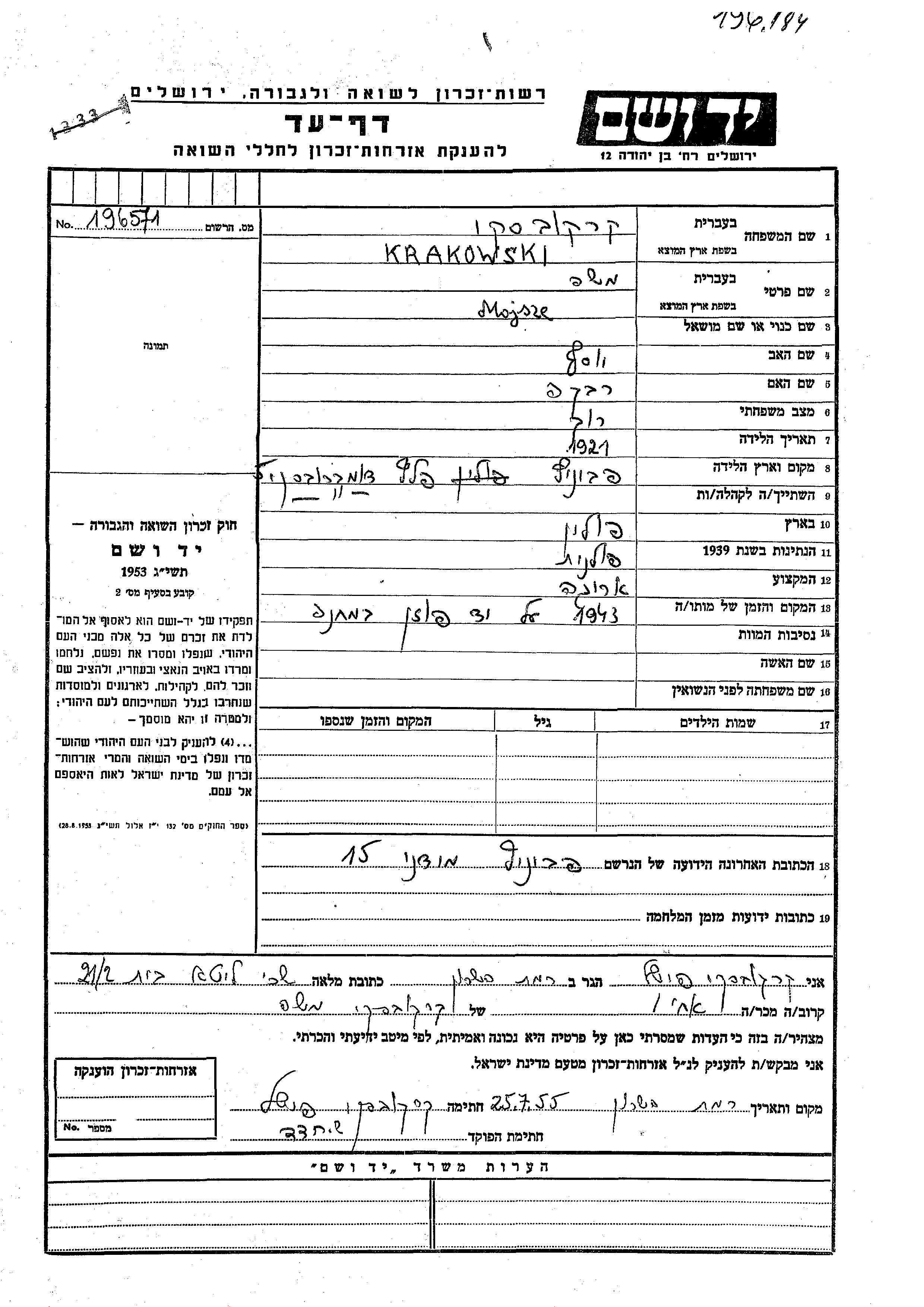 Mojsze Krakowski wurde im Jahr 1921 in Pabianice, Polen geboren. Er war der Sohn von Yosef und Rivka. Er war Weber/-in und Ledig. Vor dem Zweiten Weltkrieg lebte er in Pabianice, Polen. Während des Krieges war er in Pabianice, Polen.