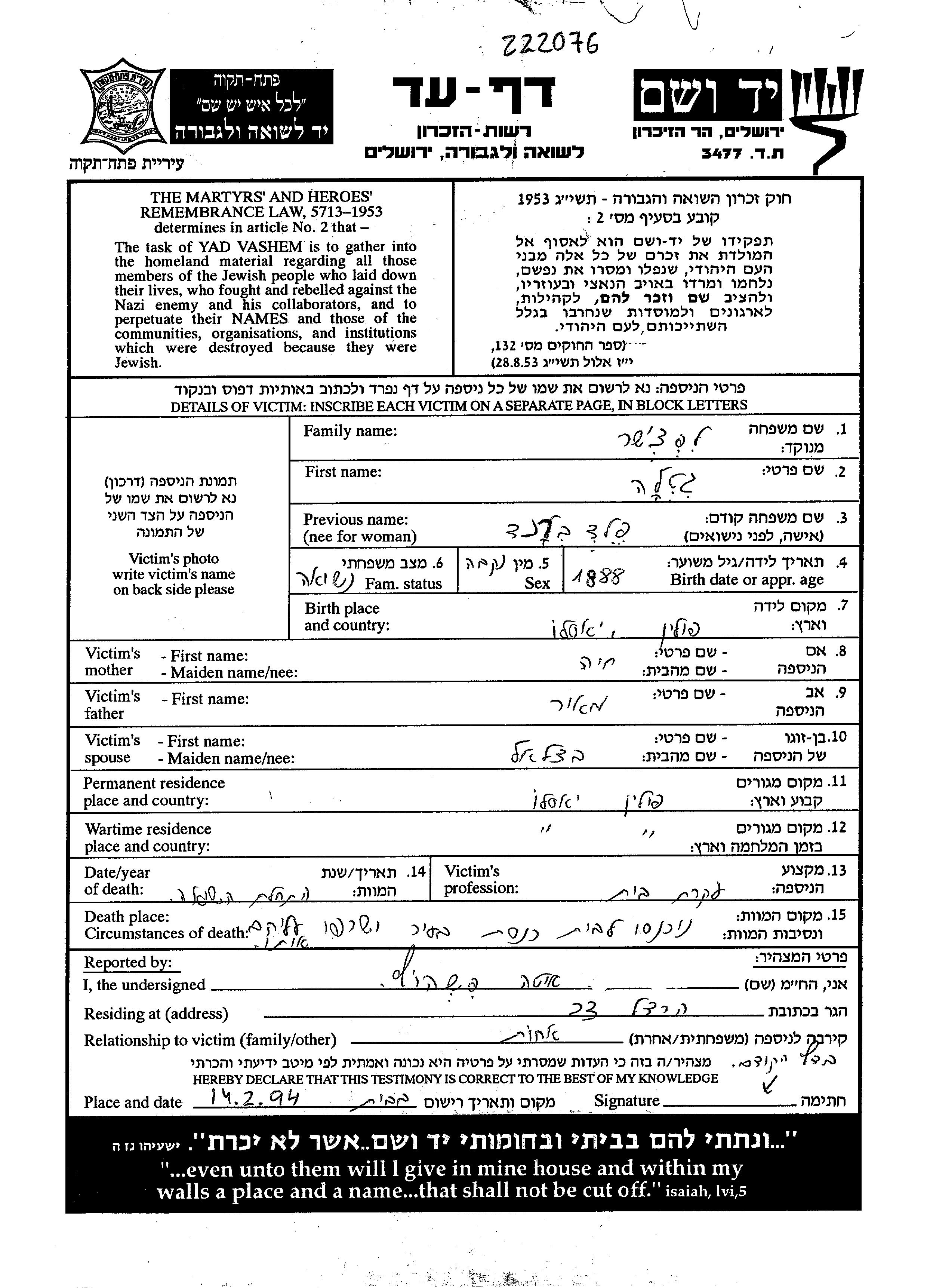 Gitel Lipscher, geb. Feldbrand wurde im Jahr 1888 in Jaslo, Polen geboren. Sie war Hausfrau. Vor dem Zweiten Weltkrieg lebte sie in Jaslo, Polen.