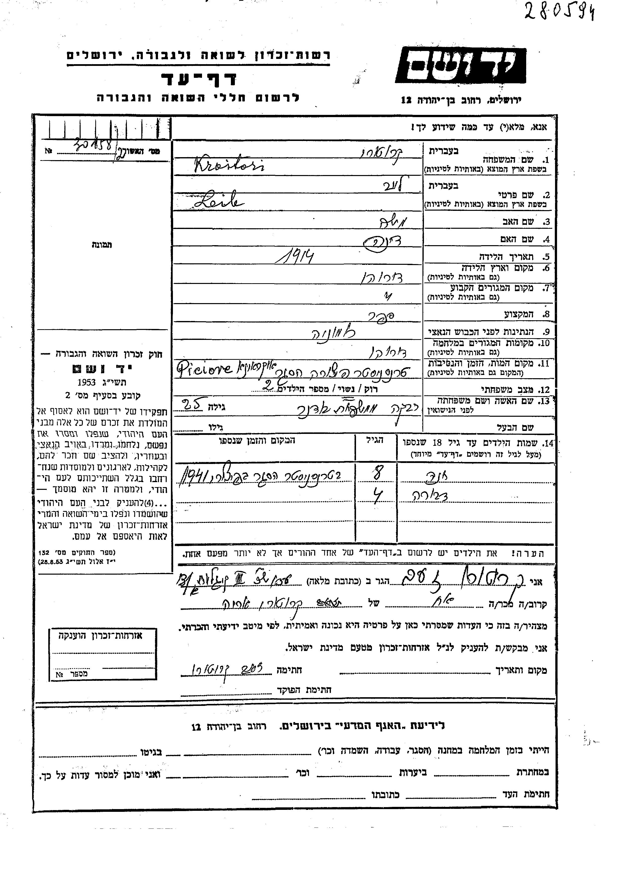 Leib Kroitori wurde im Jahr 1914 in Dorohoi, Rumänien geboren. Er war der Sohn von Moshe und Dina. Er war Friseur/-in und mit Rivka, geb. Bodner Verheiratet. Vor dem Zweiten Weltkrieg lebte er in Dorohoi, Rumänien. Während des Krieges war er in Dorohoi, Rumänien.