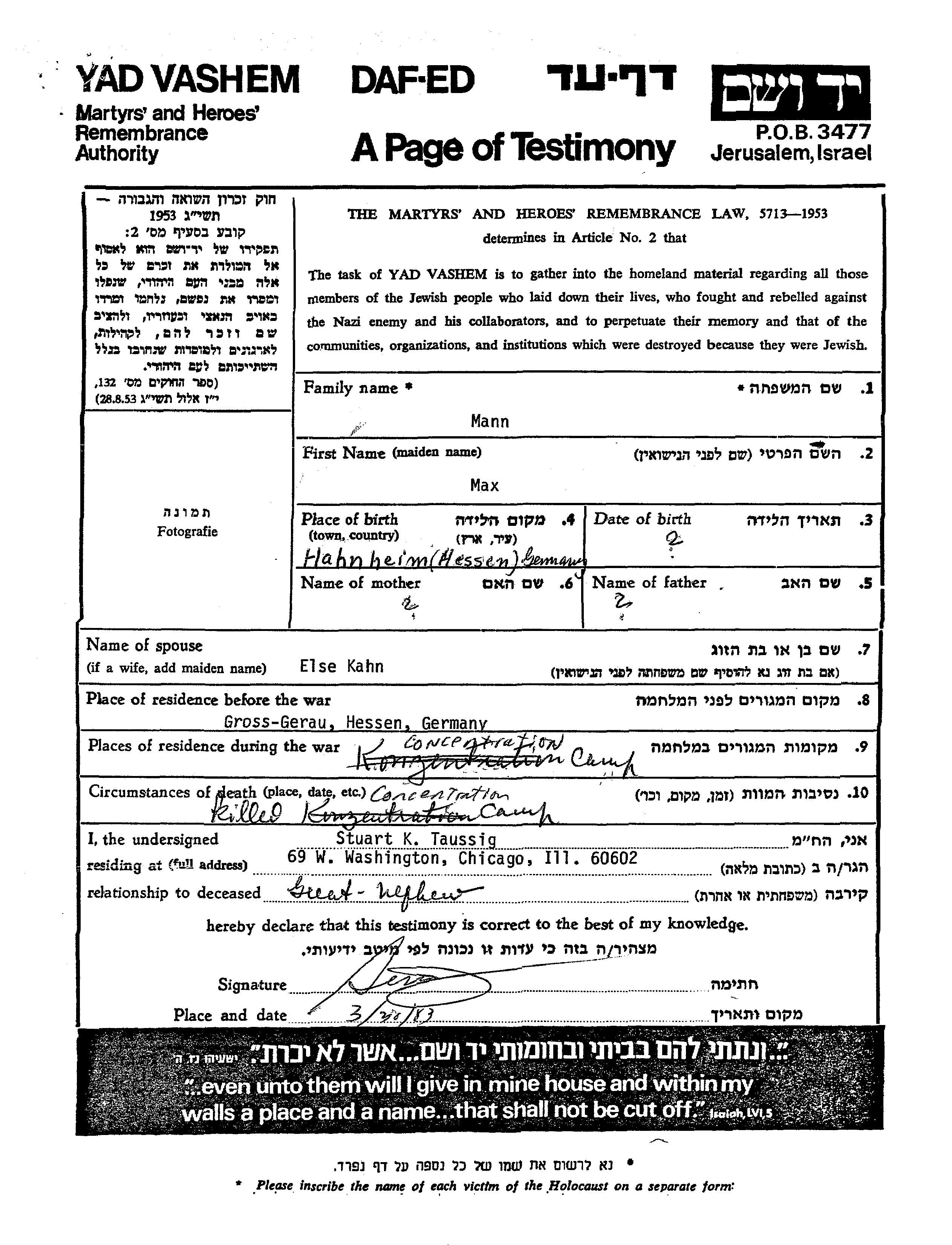 Max Mann wurde in Hahnheim, Deutsches Reich geboren. Vor dem Zweiten Weltkrieg lebte er in Gross Gerau, Deutsches Reich.