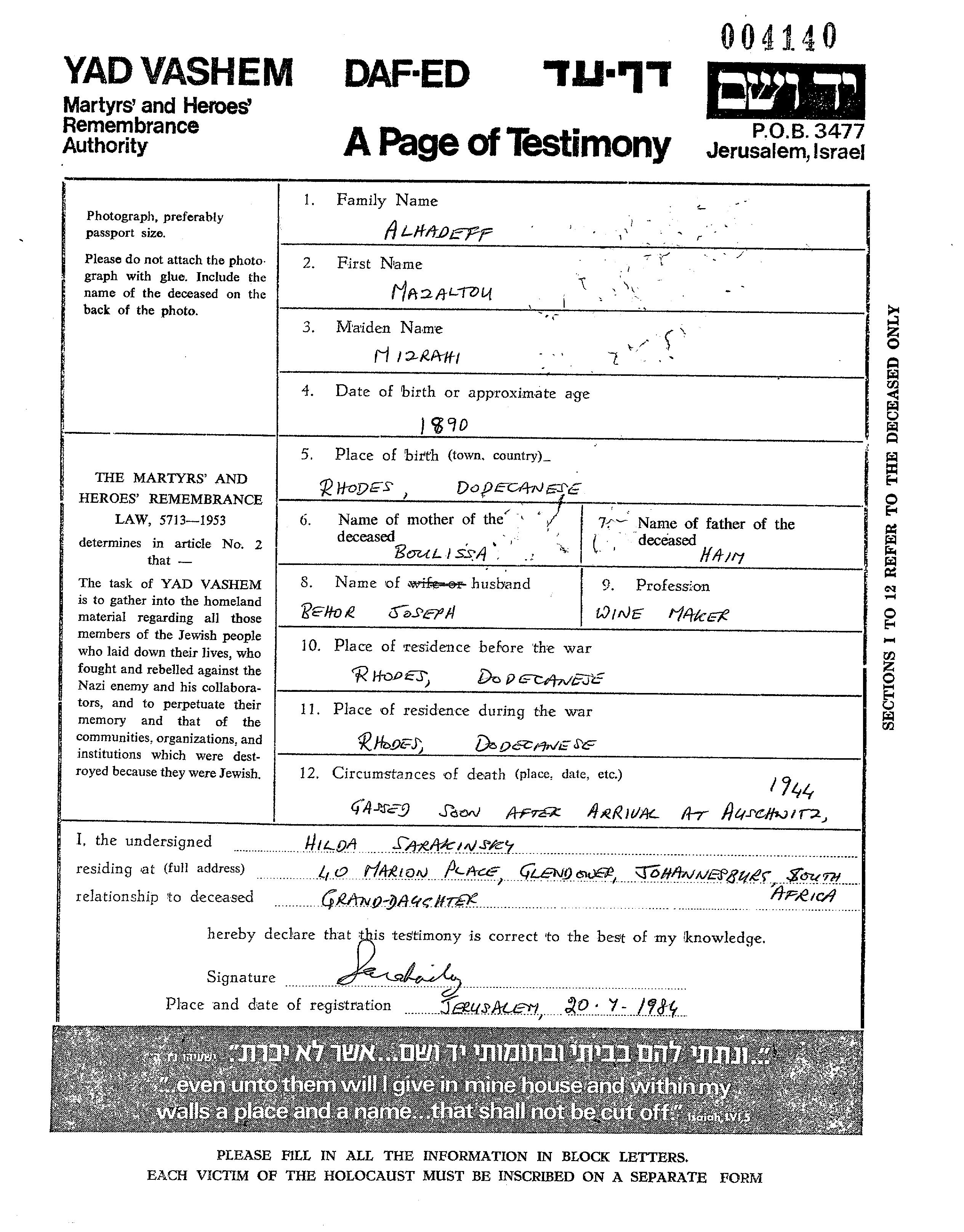 Mazaltov Alhadeff, geb. Mizrahi wurde im Jahr 1890 in Rhodes, Italien geboren. Sie war Weinprüfer. Vor dem Zweiten Weltkrieg lebte sie in Rhodes, Italien.